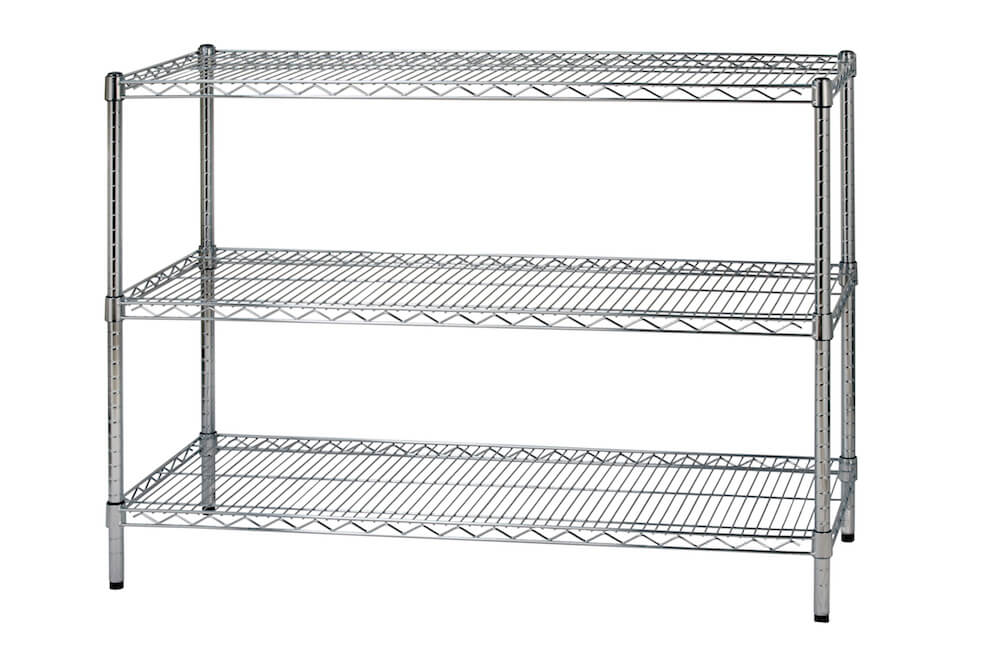 Étagère en finition chromée emballée dans une boîte de couleur robuste et d'apparence agréable pour une présentation attrayante. Equipé de 3 étagères d'une capacité maximale de 100 kg chacune.