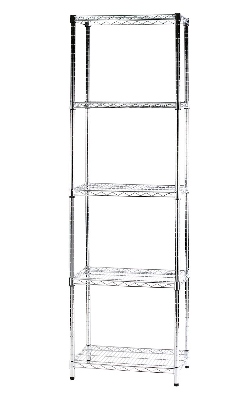 Étagère en finition chromée emballée dans une boîte de couleur robuste et d'apparence agréable pour une présentation attrayante. Equipé de 5 étagères d'une capacité maximale de 100 kg chacune.