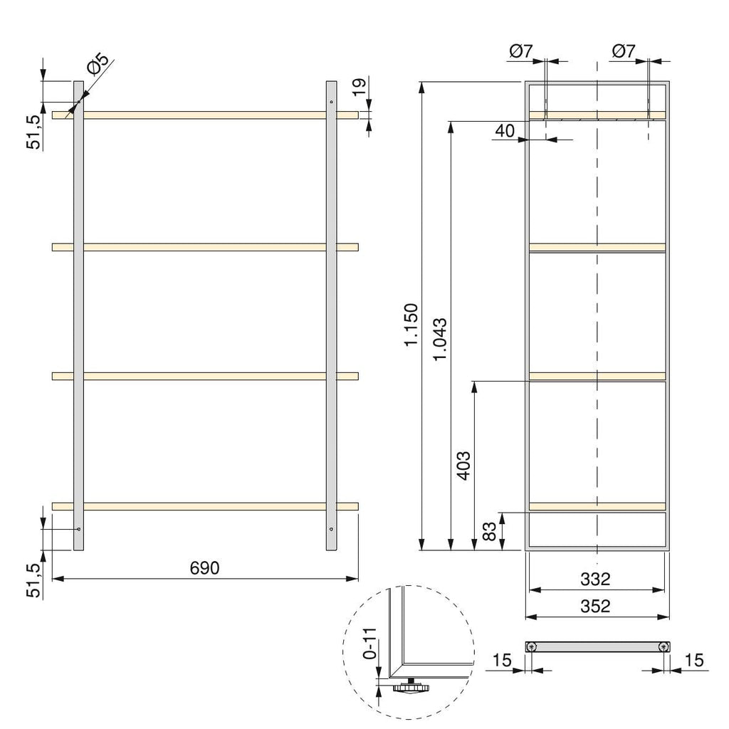 - Étagères d'une longueur de 690 mm et d'une épaisseur de 19 mm.