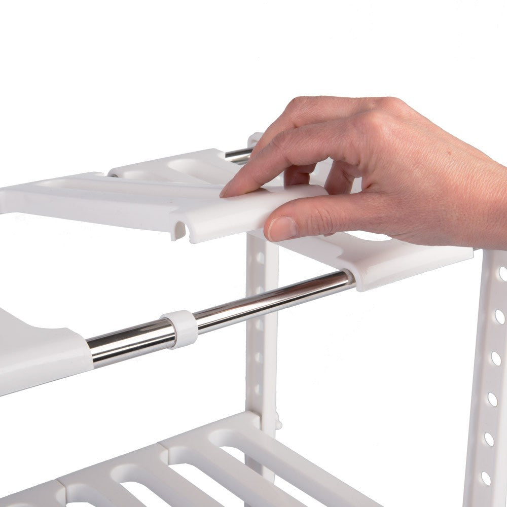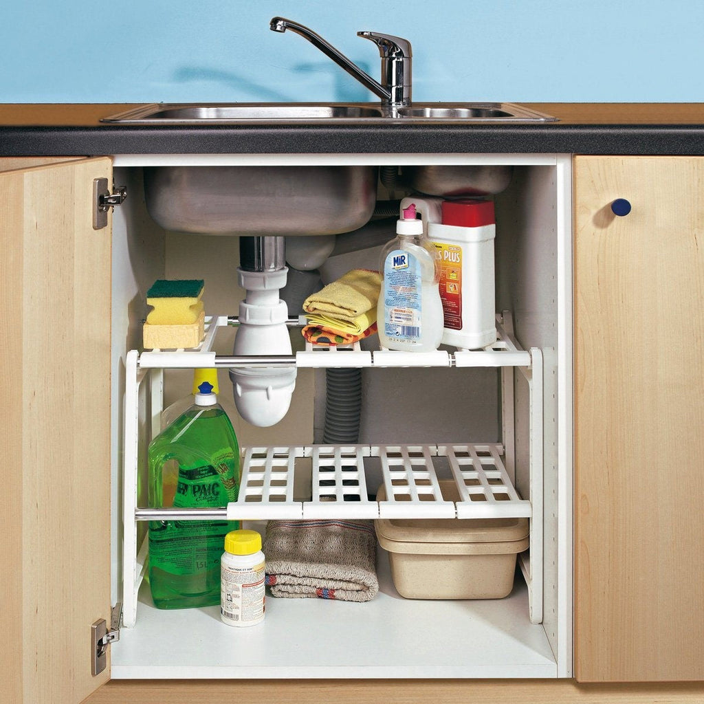 Cette étagère à 2 étagères a été conçue pour s'adapter à n'importe quel meuble ou sous l'évier : la surface supérieure est modulable et peut être modifiée à volonté pour permettre une insertion correcte entre les canalisations, le siphon, les canalisations d'évacuation existantes. pour loger des objets