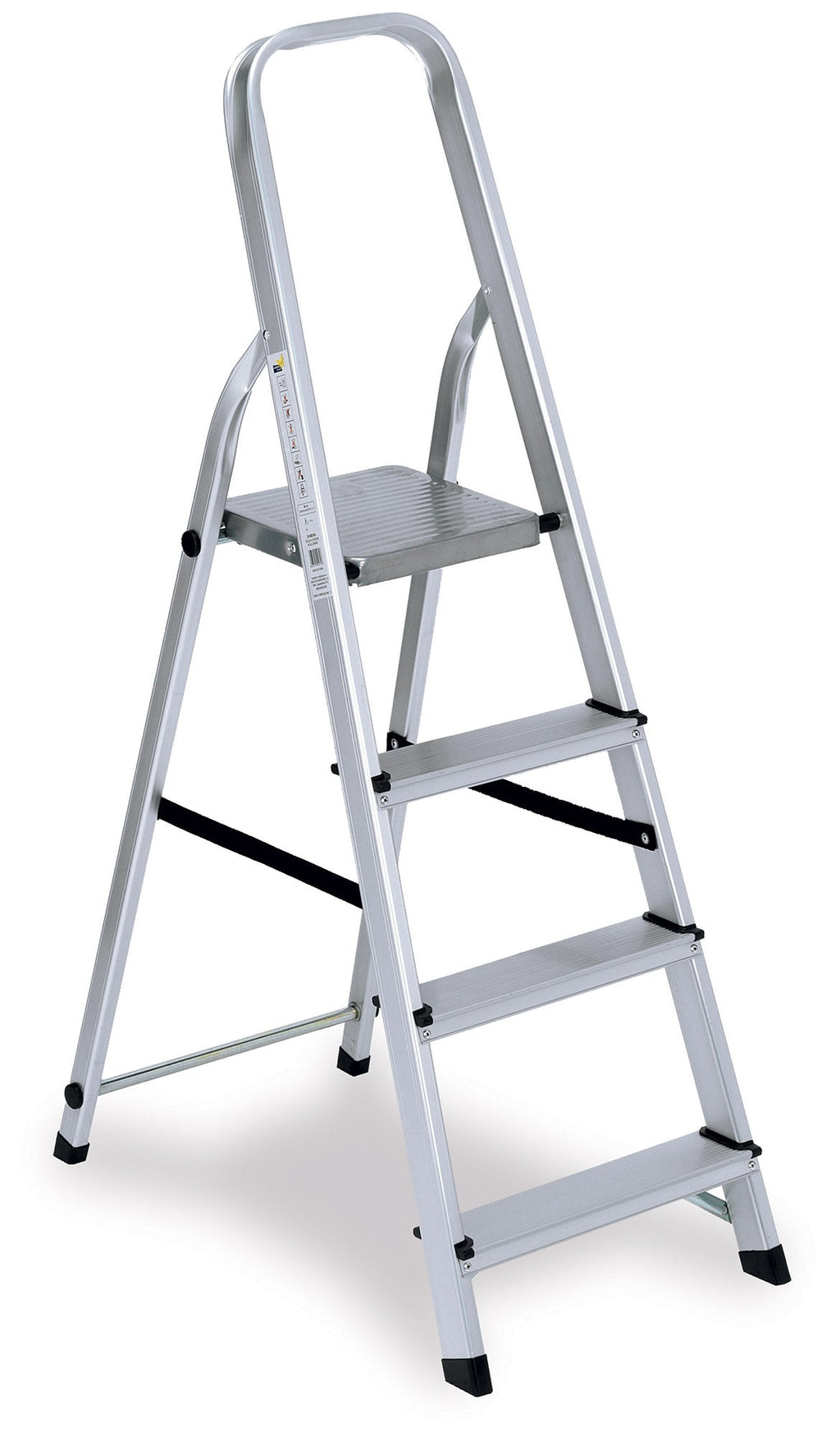 Échelle en aluminium avec quatre marches antidérapantes, pointes antidérapantes, ruban anti-étalement et crochet de sécurité. Recommandé pour un usage domestique et de bricolage. Capacité maximale 150 kg.
