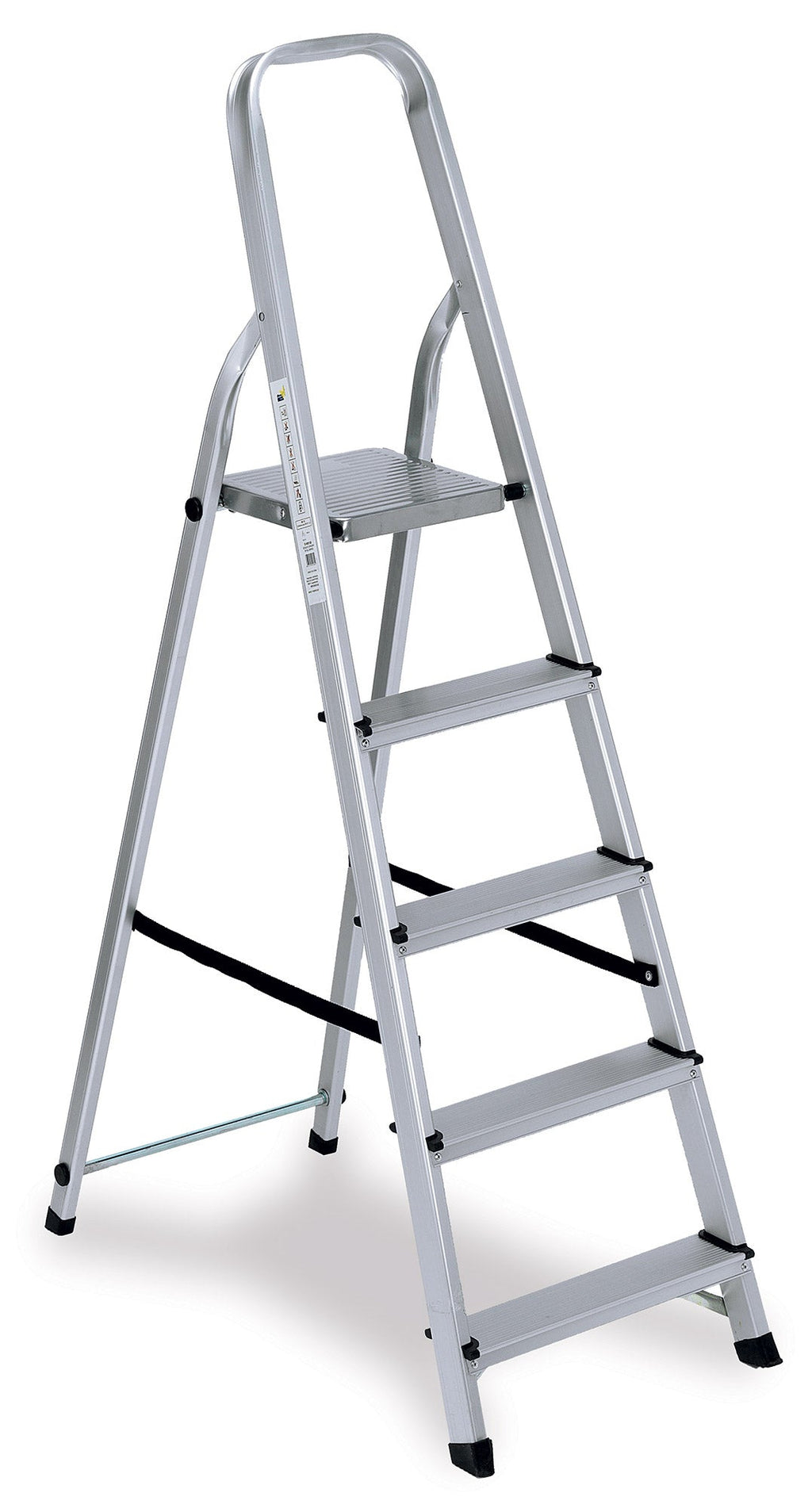 Échelle en aluminium avec cinq marches antidérapantes, pointes antidérapantes, ruban anti-étalement et crochet de sécurité. Recommandé pour un usage domestique et de bricolage. Capacité maximale 150 kg.