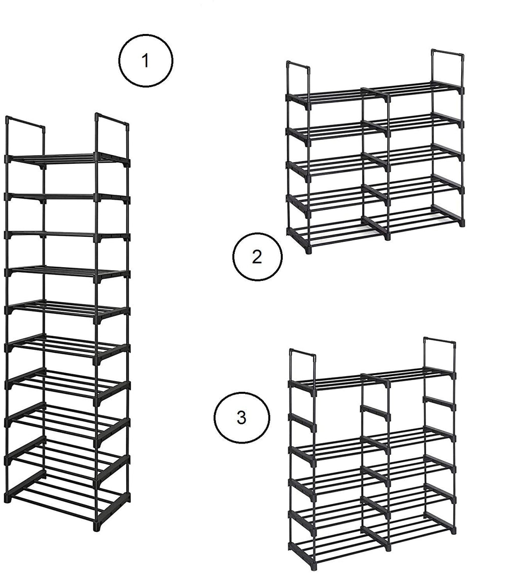 Ne retenez plus votre envie d'acheter de nouvelles chaussures, avec ce meuble à chaussures vous disposerez de 10 étagères. Fabriqué à partir de tubes métalliques robustes et de connecteurs en plastique de qualité, offrant un support solide à vos chaussures bien-aimées, jusqu'à 5 kg pour chaque étagère. L'étagère à chaussures est empilable, vous pouvez l'agrandir en fonction de vos besoins d'organisation. Vous pouvez empiler les 10 étagères pour tirer le meilleur parti de la hauteur ou la diviser en plusieurs étagères. Vous pouvez également séparer ou ajuster la hauteur de l'étagère en en sautant une pour faire de la place aux bottes hautes. Un modèle d'étagère vraiment polyvalent. Design simple et moderne, il trouve sa place partout : dans l'entrée ou l'armoire pour vos nombreuses chaussures, dans le salon pour les jeux et les livres, ou divisez-le en deux étagères, une dans la chambre pour les cartons et une autre sur le balcon pour les plantes.