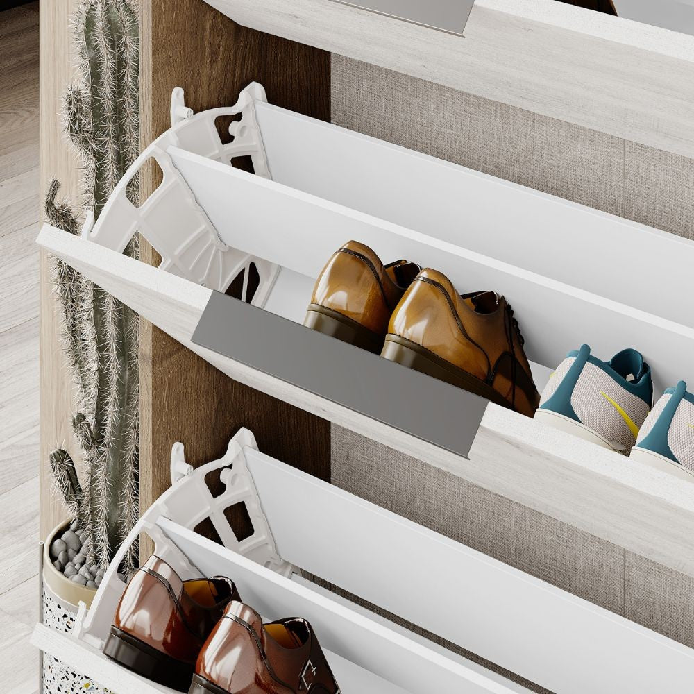 - La scarpiera Kaju è elegante e funzionale, con 3 ante a ribalta e doppio ripiano porta scarpe