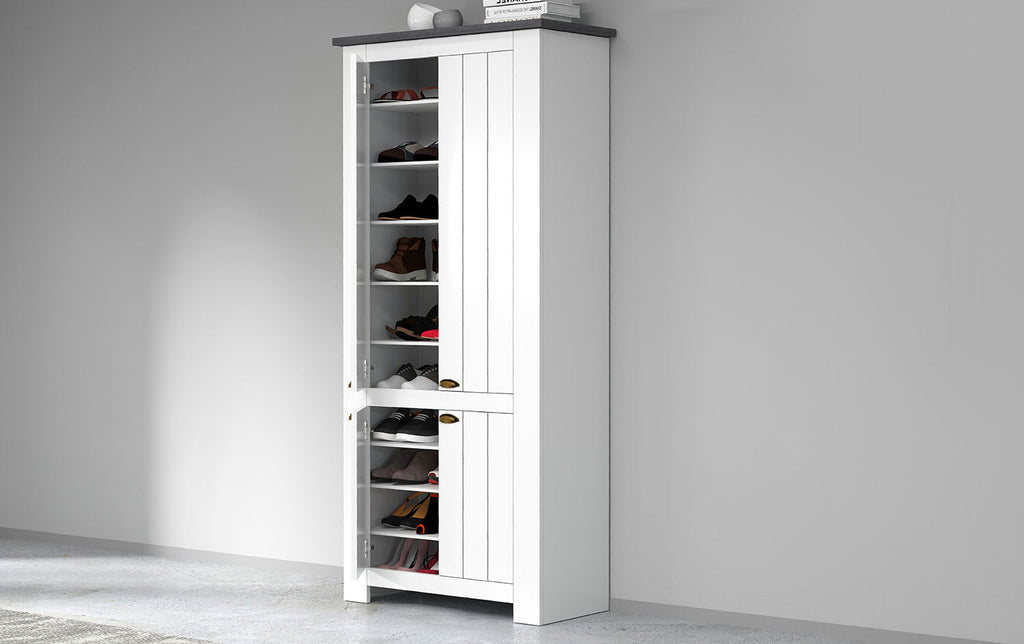 Quello che rende unico l'armadio scarpiera FIGO sono le righe disegnate nelle quattro ante con chiusura a battente. L'interno, dotato di nove ripiani, possono accogliere fino a 40 paia di scarpe, ma per le dimensioni generose del mobile e dei ripiani si presta anche come soluzione di storing di altri oggetti per lo sgombero della casa. Questa caratteristica rende la scarpiera a 4 ante FIGO un complemento d'arredo versatile e ideale da posizionare in vari ambienti. L'armadio scarpiera FIGO a 4 ante fa parte dei nostri prodotti di punta per il design particolare ma semplice e quindi perfetto per essere inserito in qualsiasi contesto abitativo. La possibilità di scegliere il top tra due varianti di colore, grigio report o rovere, permette di adattare la scarpiera FIGO all'arredamento del resto della casa.