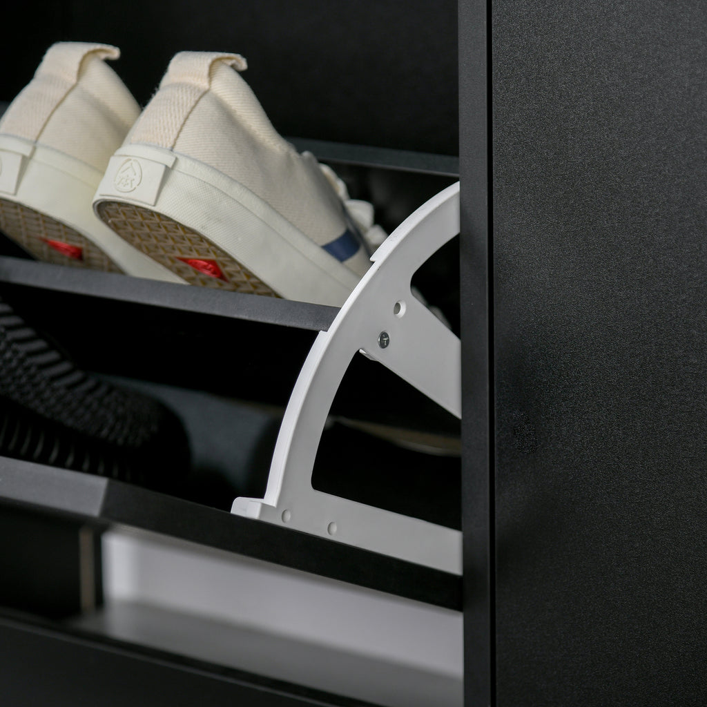 - 3 compartiments avec portes abattantes, chacun doté de 2 étagères, chaque étagère peut contenir jusqu'à 3 paires de chaussures.