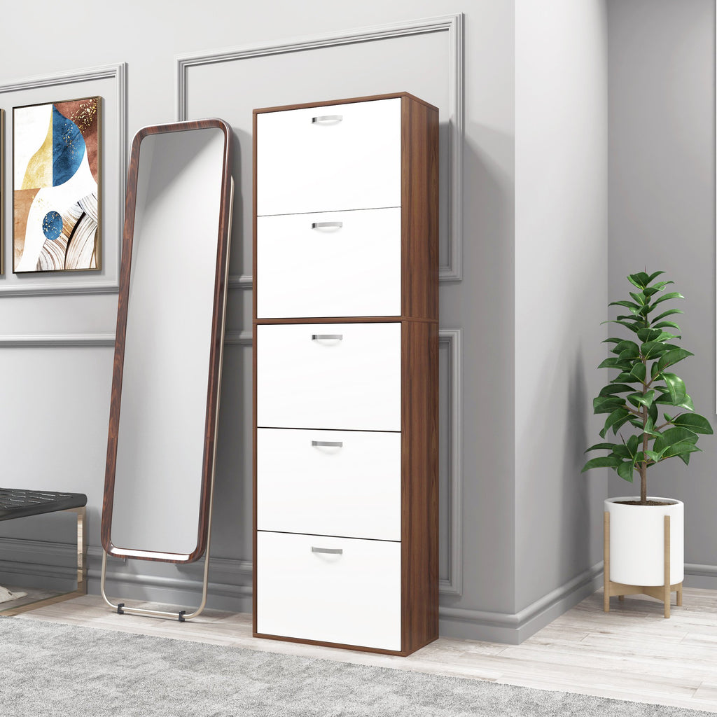 Il dispose de 5 compartiments à rabat ouvrant chacun avec 2 étagères, il peut contenir jusqu'à 30 paires de chaussures