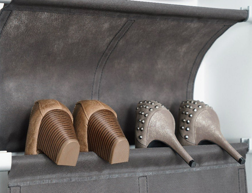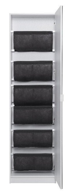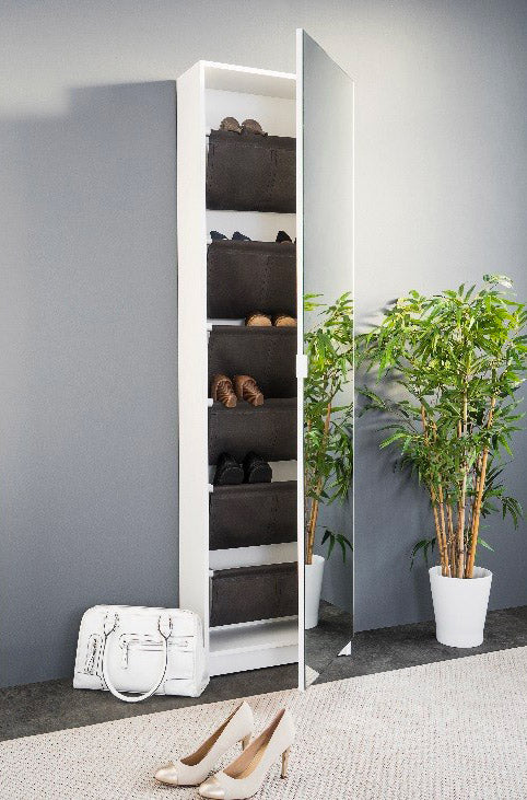 Étagère à chaussures moderne au design intemporel, réalisée avec des matériaux de haute qualité. Le corps est dans une belle décoration blanche, avec une façade en miroir. Les six compartiments à chaussures en tissu offrent de la place pour environ douze paires de chaussures. Le chaos dans les couloirs appartient au passé, car l'ordre est garanti avec ce cabinet.