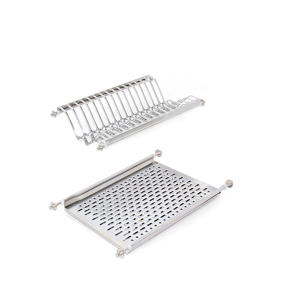 Égouttoir à vaisselle avec deux étagères et égouttoir, entièrement réalisé en acier inoxydable (les égouttoirs pour vaisselle et verres en acier inox AISI 430 et l'égouttoir en acier inox AISI 304). Améliorez et optimisez l'ordre des assiettes et des verres dans les meubles de cuisine. L'installation est très simple et la fixation au meuble est très résistante : assemblage à l'aide de 8 goupilles latérales qui ajustent le plateau au meuble.