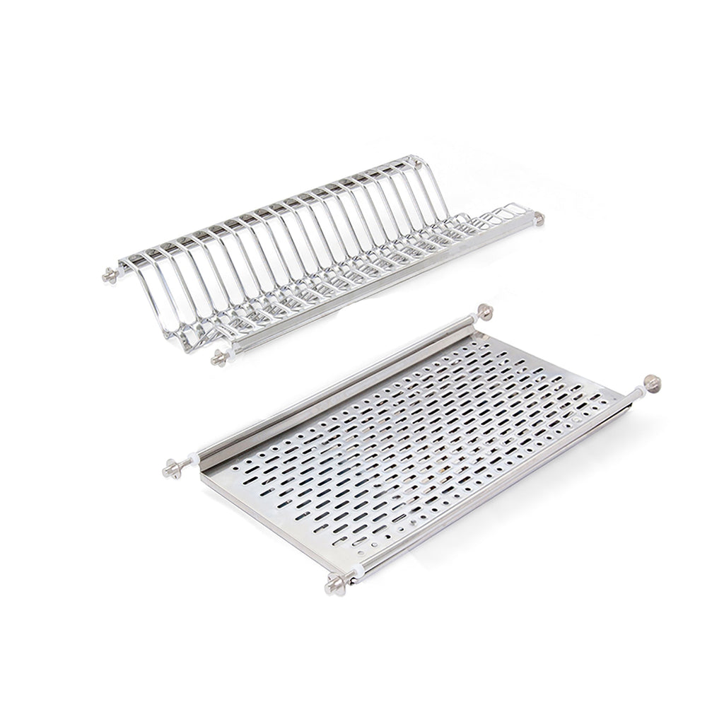 Égouttoir à vaisselle avec deux étagères et égouttoir, entièrement réalisé en acier inoxydable (les égouttoirs pour vaisselle et verres en acier inox AISI 430 et l'égouttoir en acier inox AISI 304). Améliorez et optimisez l'ordre des assiettes et des verres dans les meubles de cuisine. L'installation est très simple et la fixation au meuble est très résistante : assemblage à l'aide de 8 goupilles latérales qui ajustent le plateau au meuble.