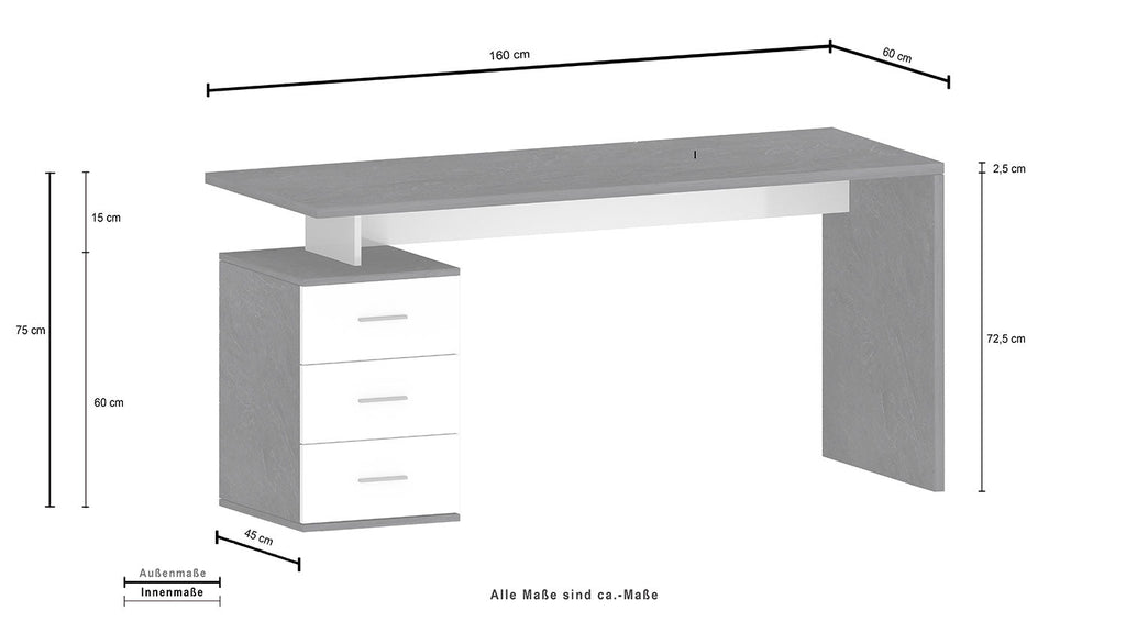 Scrivania 3 Cassetti 160x60x75 cm New Selina Bianco Lucido/Report Grigio