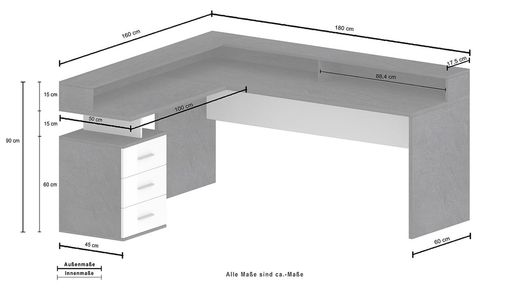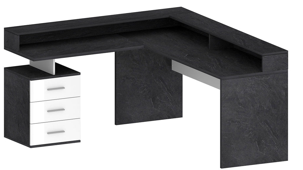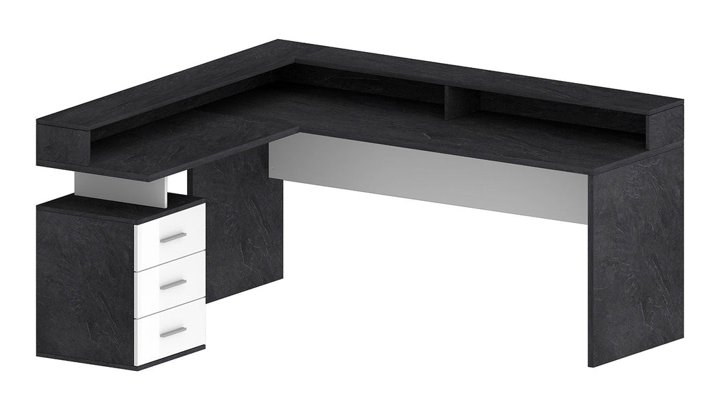 Scrivania Angolare 3 Cassetti e Ripiani a Giorno 180/160x60x90 cm New Selina Bianco Lucido/Report Grigio