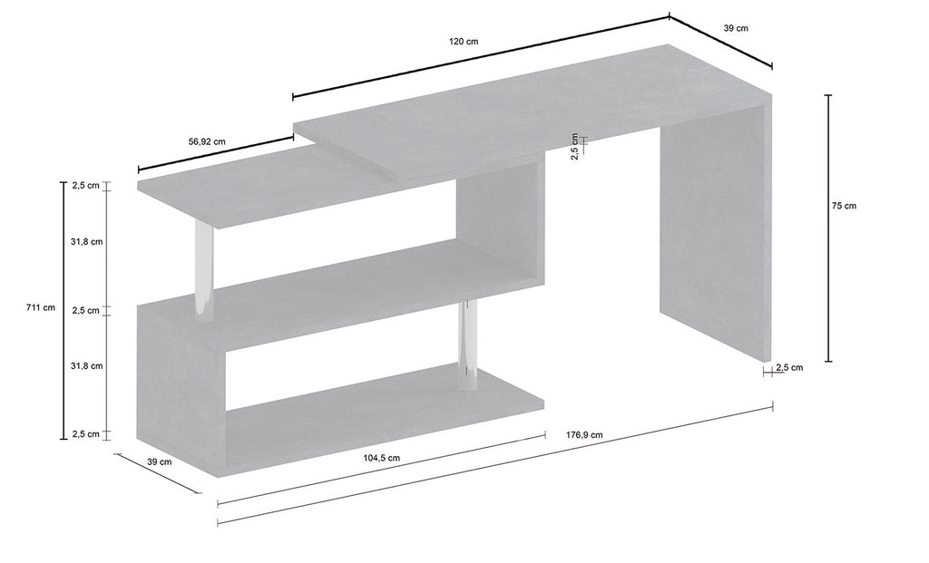Nella scrivania girevole VOLTA non ci sono cassetti, la sua peculiarità, infatti, è quella di avere una gamba a forma di "S" che crea 2 ripiani aperti nei quali riporre oggetti e documenti di lavoro. Questa scrivania girevole è in grado di unire praticità e comfort. La struttura è realizzata in melamina di 25 mm di spessore e di colore bianco lucido, report o rovere wotan oak. Viene consegnata in un kit di montaggio, con istruzioni semplici e dettagliate.