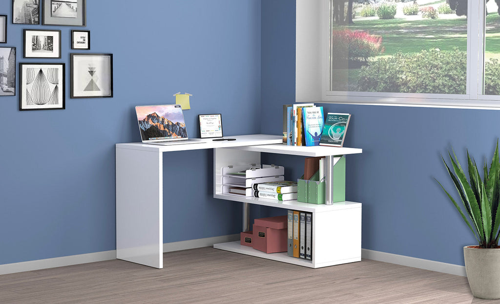 Nella scrivania girevole VOLTA non ci sono cassetti, la sua peculiarità, infatti, è quella di avere una gamba a forma di "S" che crea 2 ripiani aperti nei quali riporre oggetti e documenti di lavoro. Questa scrivania girevole è in grado di unire praticità e comfort. La struttura è realizzata in melamina di 25 mm di spessore e di colore bianco lucido, report o rovere wotan oak. Viene consegnata in un kit di montaggio, con istruzioni semplici e dettagliate.