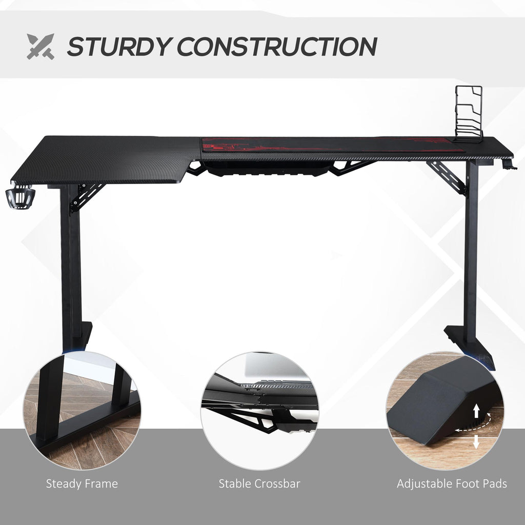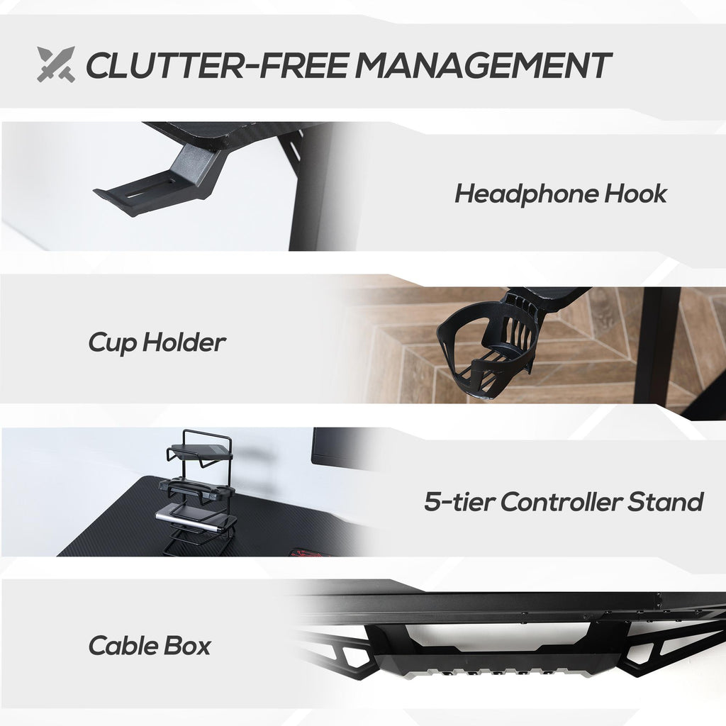 Pour travailler et jouer au mieux, vous avez besoin du bon poste de travail et le bureau d'angle est fait pour vous ! Il présente un design attrayant avec une surface effet fibre de carbone et est équipé d'accessoires pratiques tels qu'un crochet pour casque, un porte-gobelet et un support pour manette de jeu. Grâce à la structure métallique, ce bureau moderne est destiné à durer longtemps, pour vous accompagner dans chaque aventure de vos sessions de jeu.