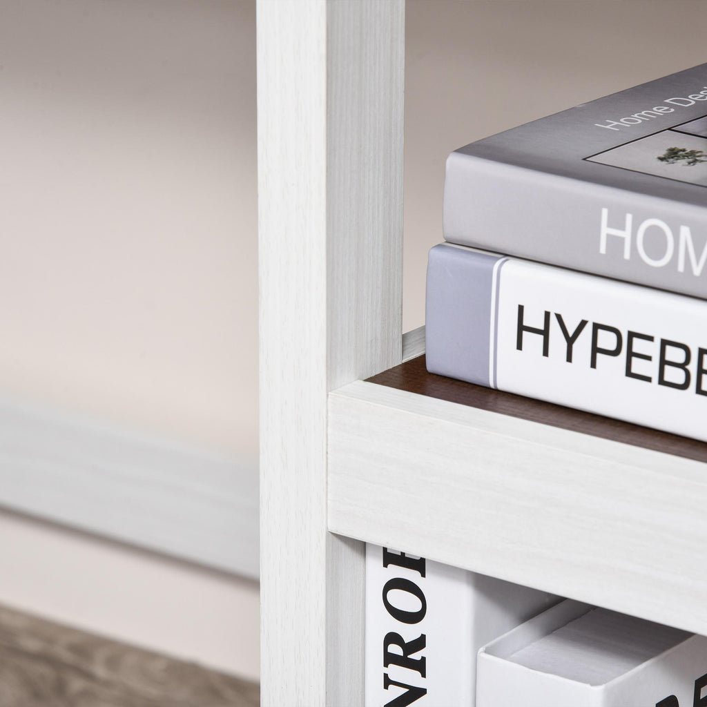 - Couleur : étagères en noyer foncé, pieds blancs