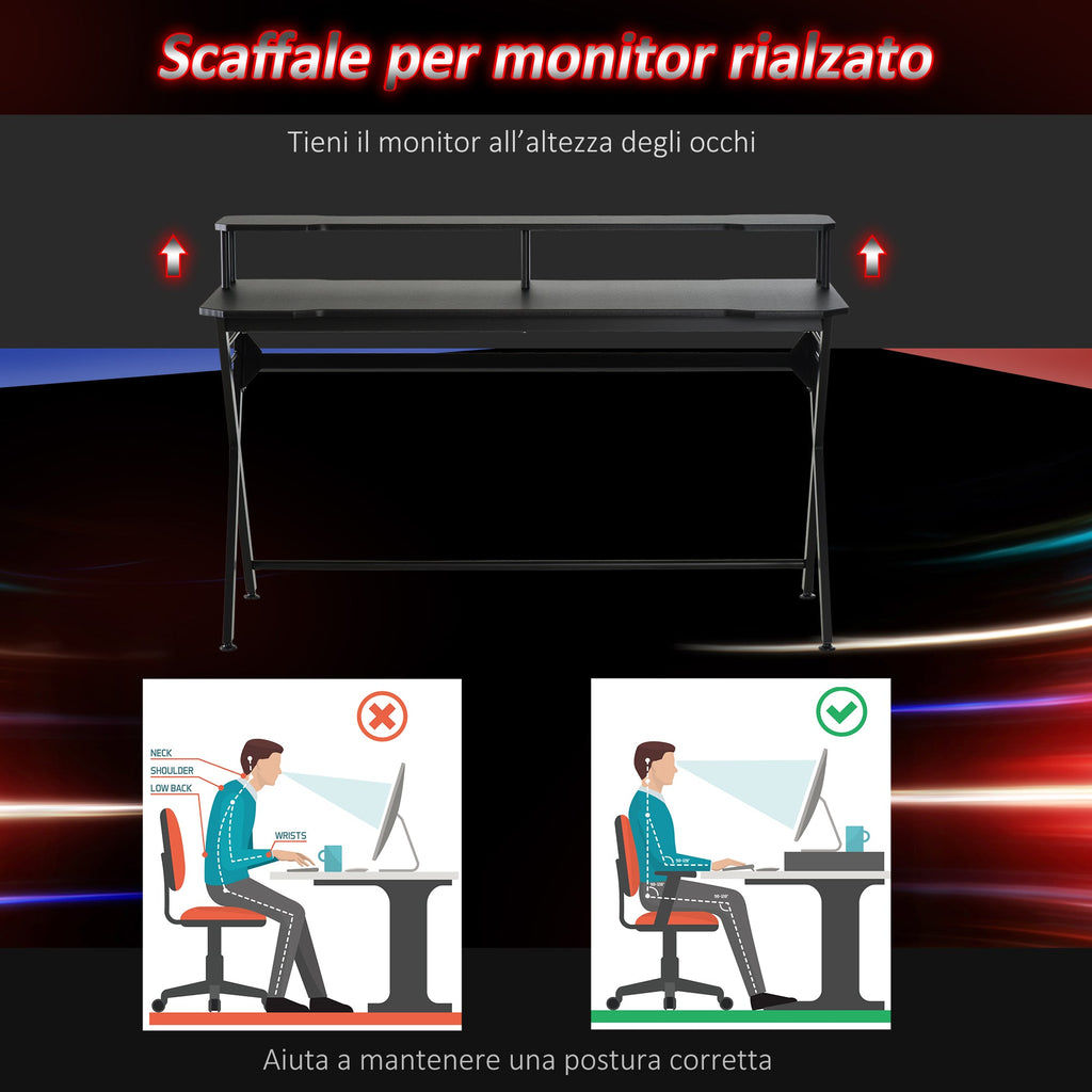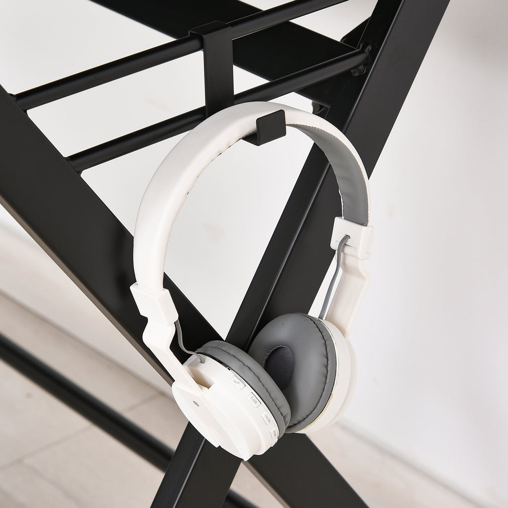 Voici un bureau pratique et fonctionnel pour tous les amateurs de jeux vidéo ! Il est équipé d'une surface surélevée sur laquelle vous pouvez placer un ou plusieurs moniteurs, et maintenir une posture correcte pendant les heures passées devant l'ordinateur. La surface de travail est grande et polyvalente : vous pouvez l'utiliser pour placer votre PC, votre souris et votre clavier. De plus, il comprend un crochet latéral pratique pour placer les écouteurs et les avoir toujours à portée de main. La surface est en MDF et les pieds sont en métal pour vous offrir une stabilité maximale.