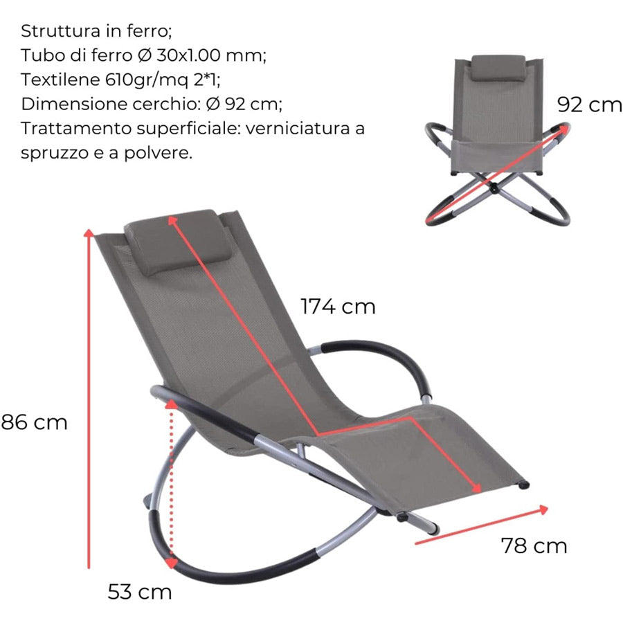 La sedia sdraio ellittica Grigio Profondo presenta una struttura in ferro robusto e un telo in textilene 2*1 da 610gr di colore Grigio Profondo.