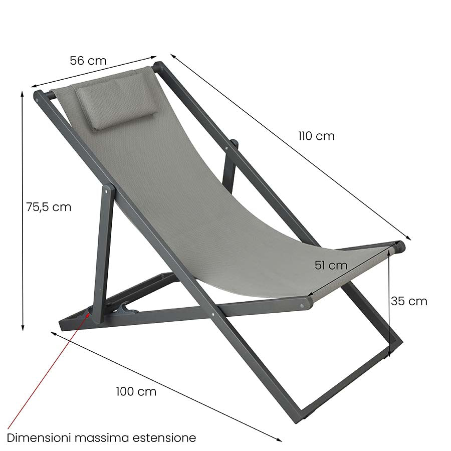 Le dimensioni della sedia a sdraio Gilda, alla sua massima estensione, sono di 100 x 56 x H. 75,5 cm, mentre le dimensioni da chiusa sono di 60 x 8 x H. 132 cm.