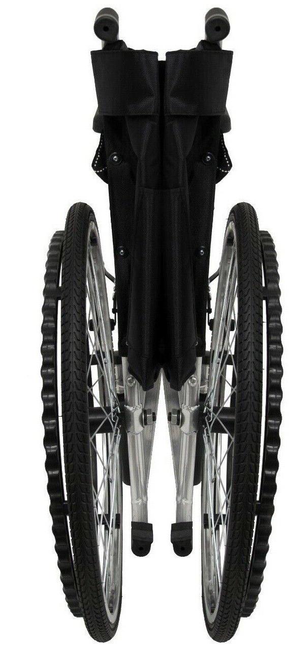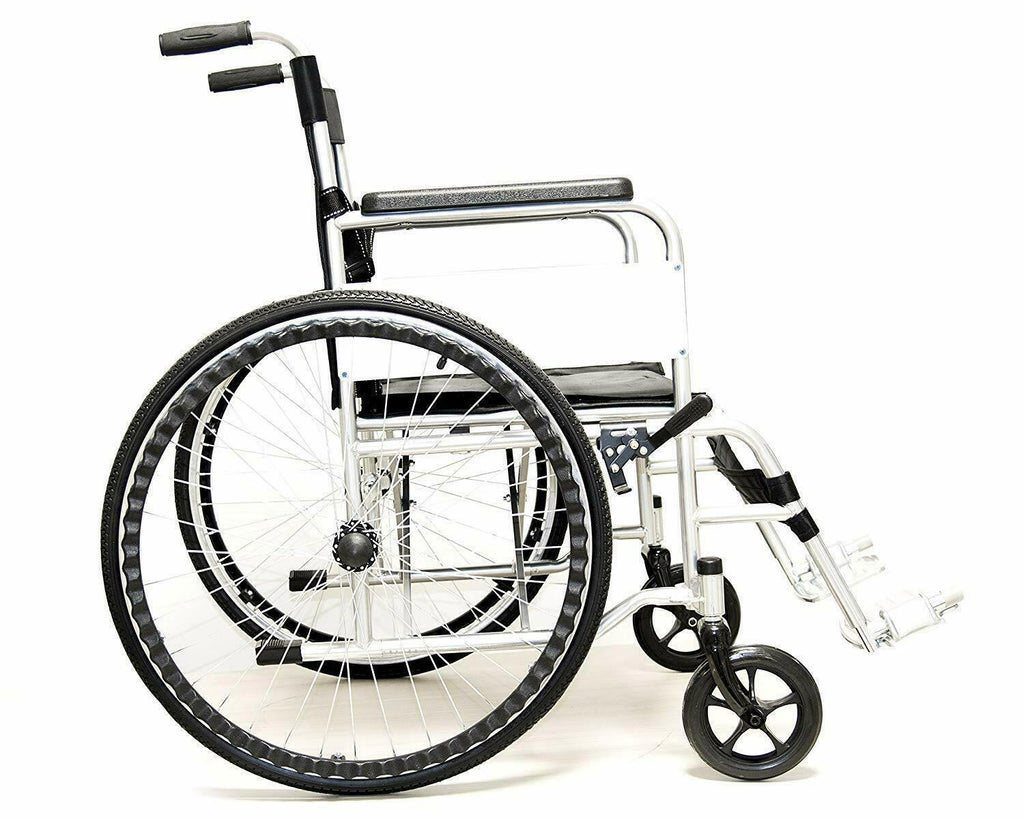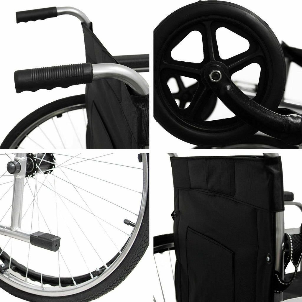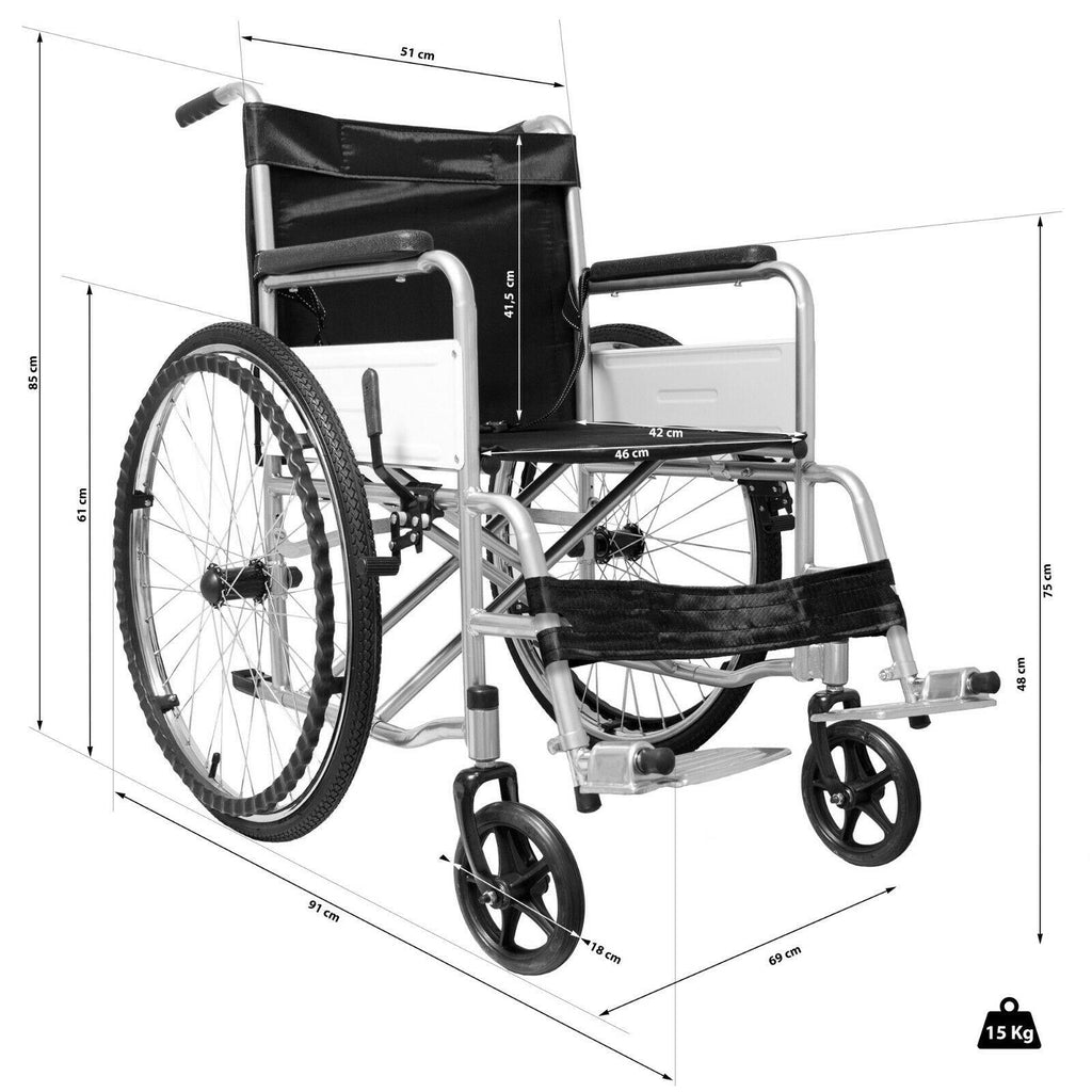 Ce fauteuil roulant pliant autopropulsé, adapté aux personnes à mobilité réduite ou ayant des difficultés à marcher, est doté d'un cadre stabilisateur en acier au carbone, de roues avant en PVC haute résistance et de roues arrière à rayons avec pneus en caoutchouc équipés de chambres à air.