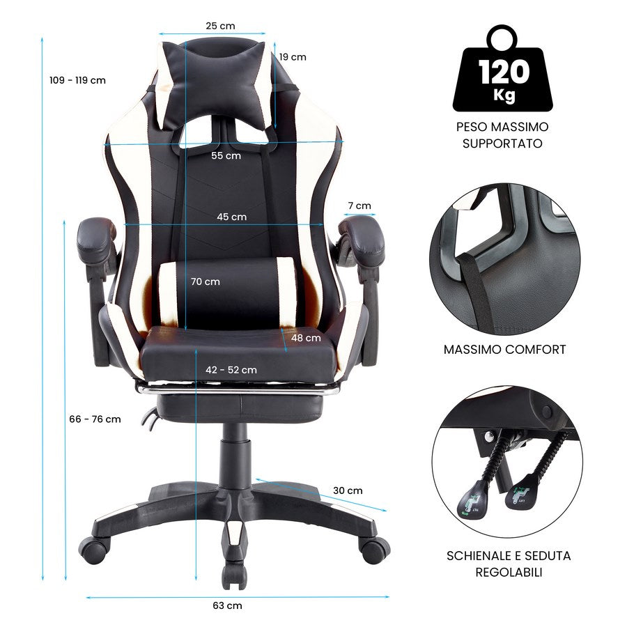 Sedia da Gaming Ergonomica in Similpelle Bianco/Nera