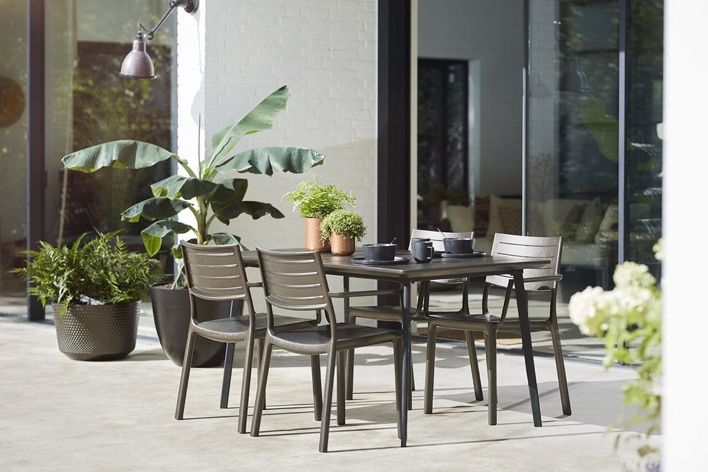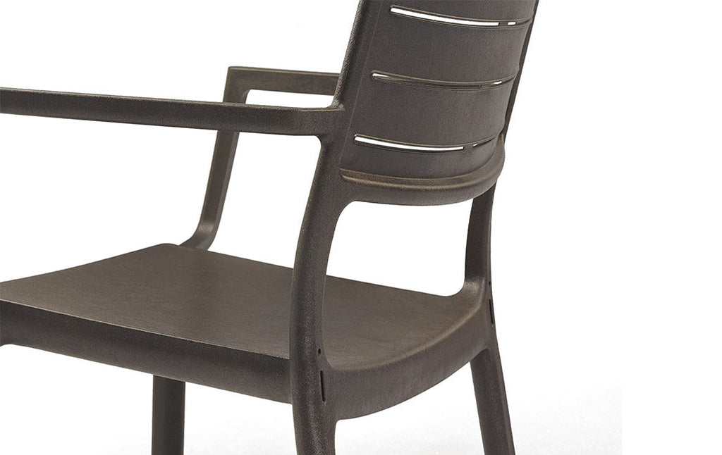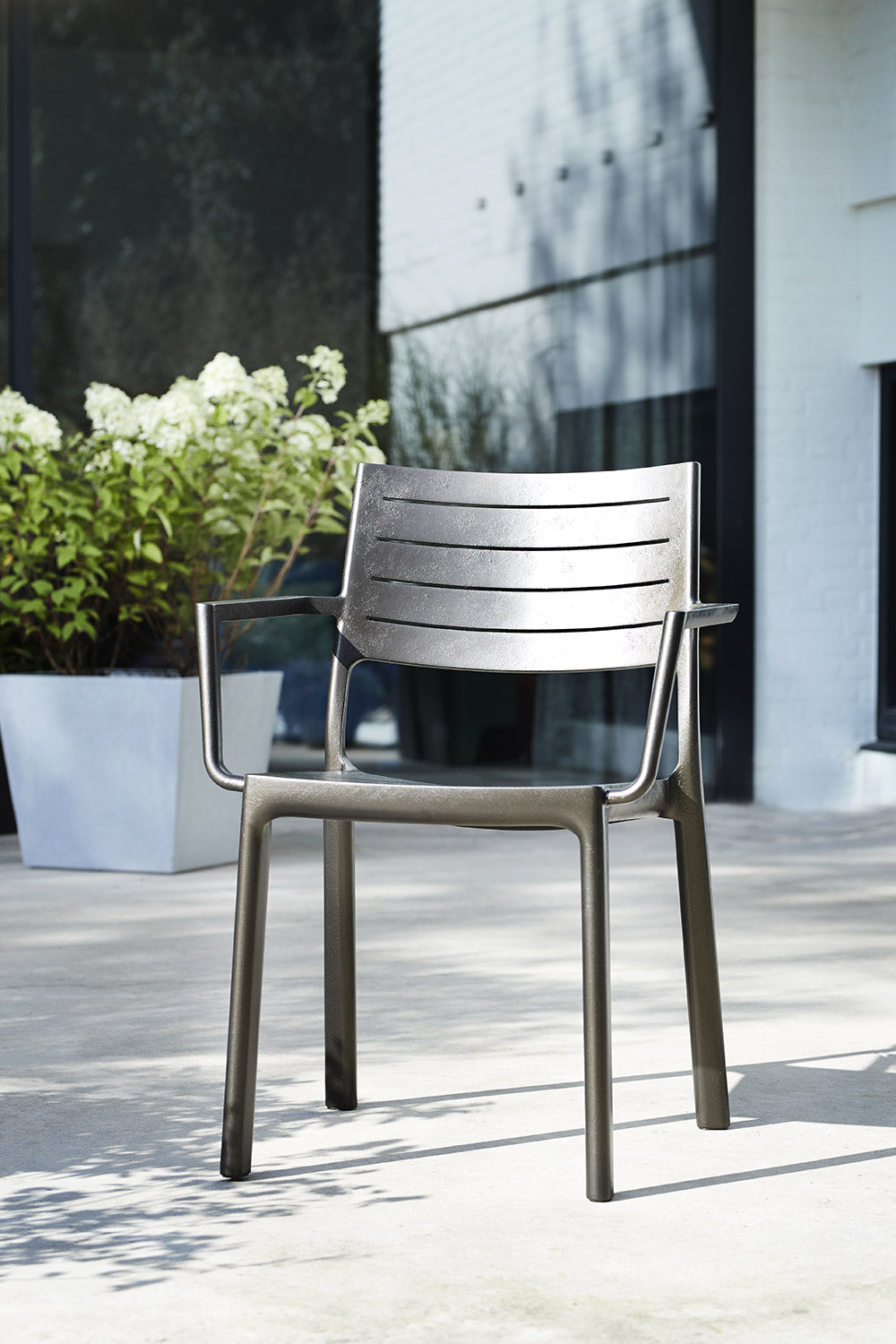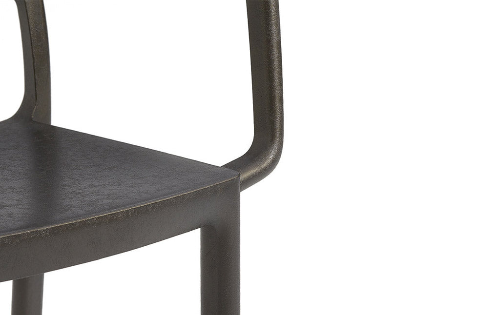 Chaise au design unique caractérisé par une finition effet métal caractéristique. La structure apporte une touche contemporaine et industrielle. Metaline est équipée de confortables lattes horizontales sur l'assise qui soulignent sa simplicité et sa linéarité. Les accoudoirs offrent un confort d'assise supplémentaire. Il ne nécessite aucun entretien et peut être facilement nettoyé avec un simple chiffon humide.