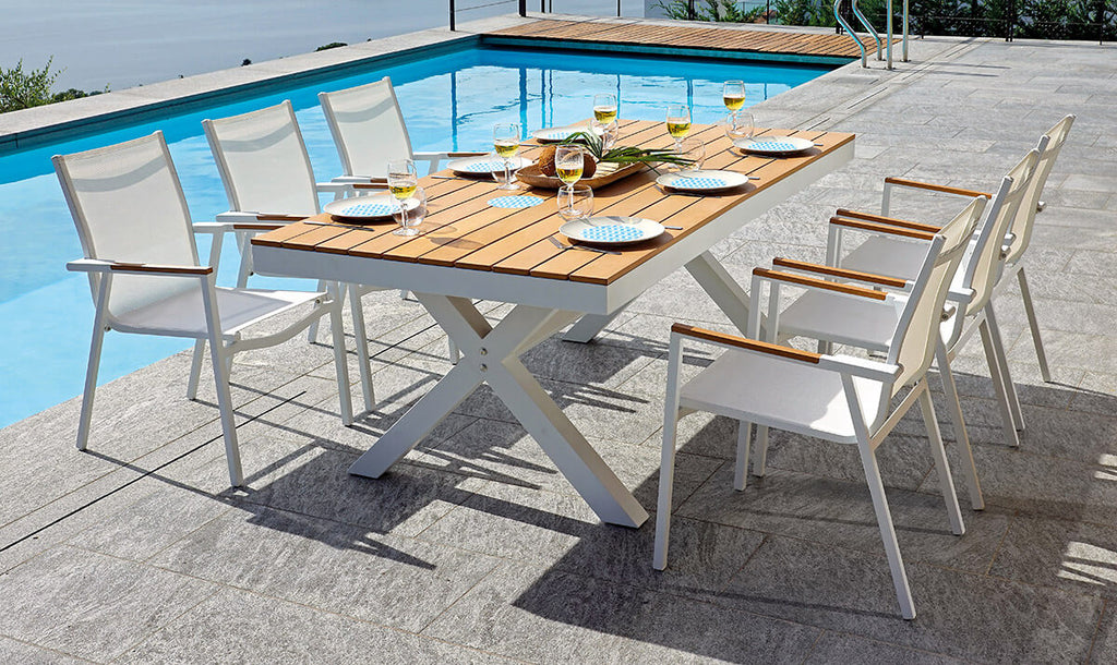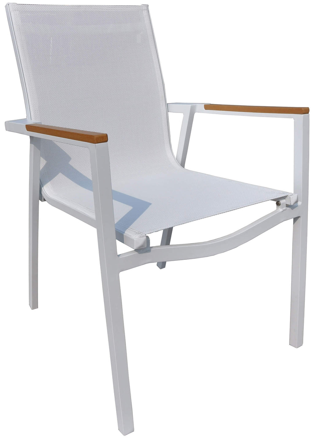 - Matériau : Structure en aluminium blanc avec accoudoirs en bois de résine couleur teck