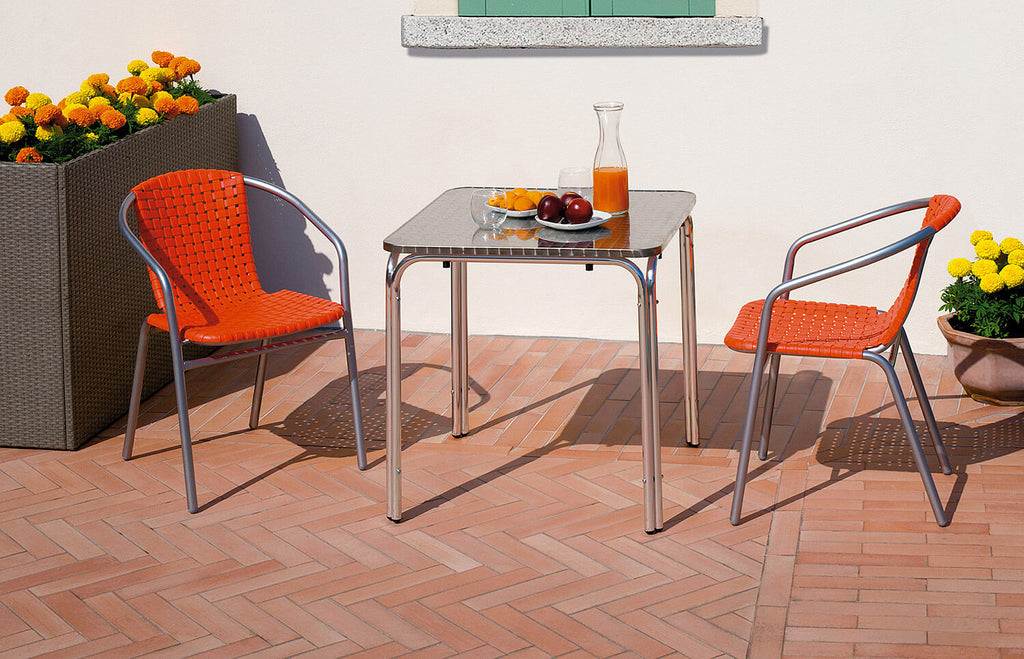 Chaise de jardin en fer argenté avec assise et dossier en plastique. Empilable.