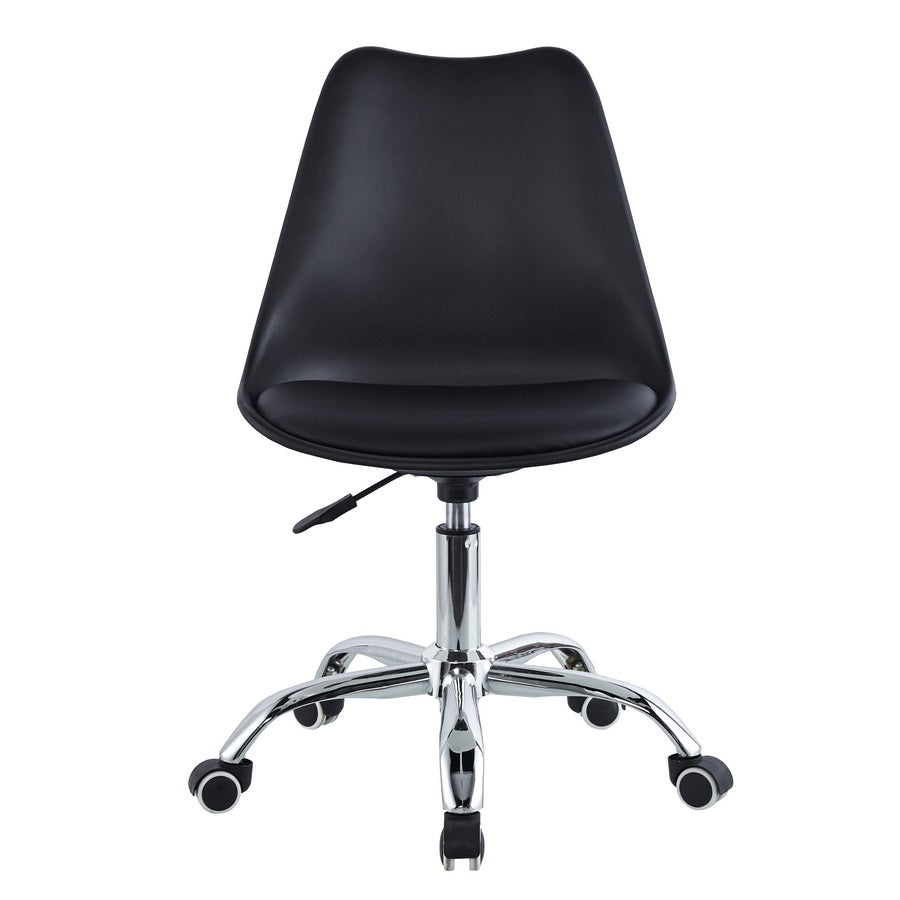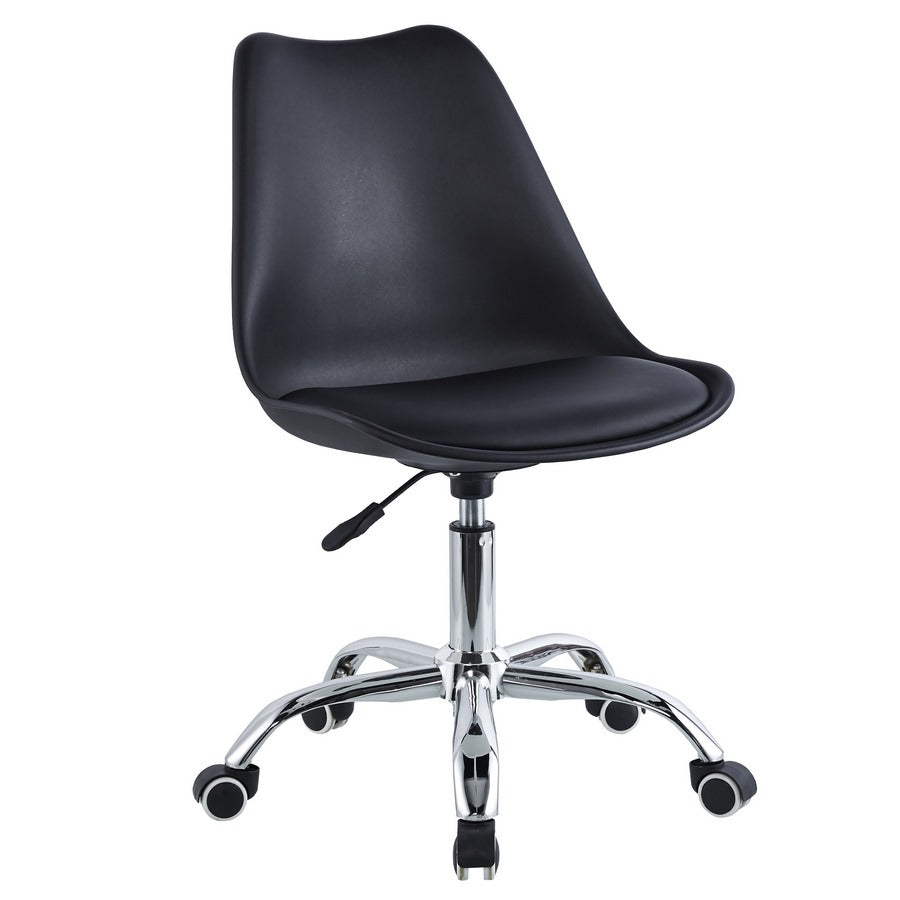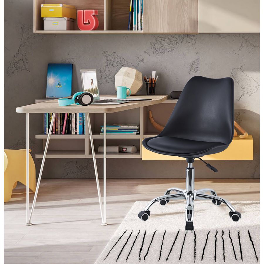 Scegli la giusta sedia ergonomica da ufficio, scegli May! Funzionale, versatile e molto ergonomica la sedia ufficio con ruote May. Una sedia ufficio dal design moderno con gambe in acciaio cromato, uno schienale e una seduta in polipropilene di colore nero con cuscino in similpelle e un'altezza regolabile tramite pistone a gas. Questa sedia da scrivania si adatta perfettamente ad un utilizzo esclusivamente interno; in ufficio o nella cameretta dei ragazzi. Ti permette di muoverti liberamente grazie alle sue 5 ruote e si adatta perfettamente con qualsiasi stile di arredamento in casa o in ufficio.