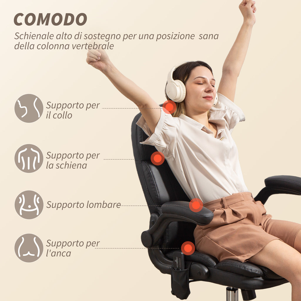 Sedia da Ufficio Operativa Massaggiante a 4 Punti con Riscaldamento e Braccioli Ribaltabili in Pelle PU Nero