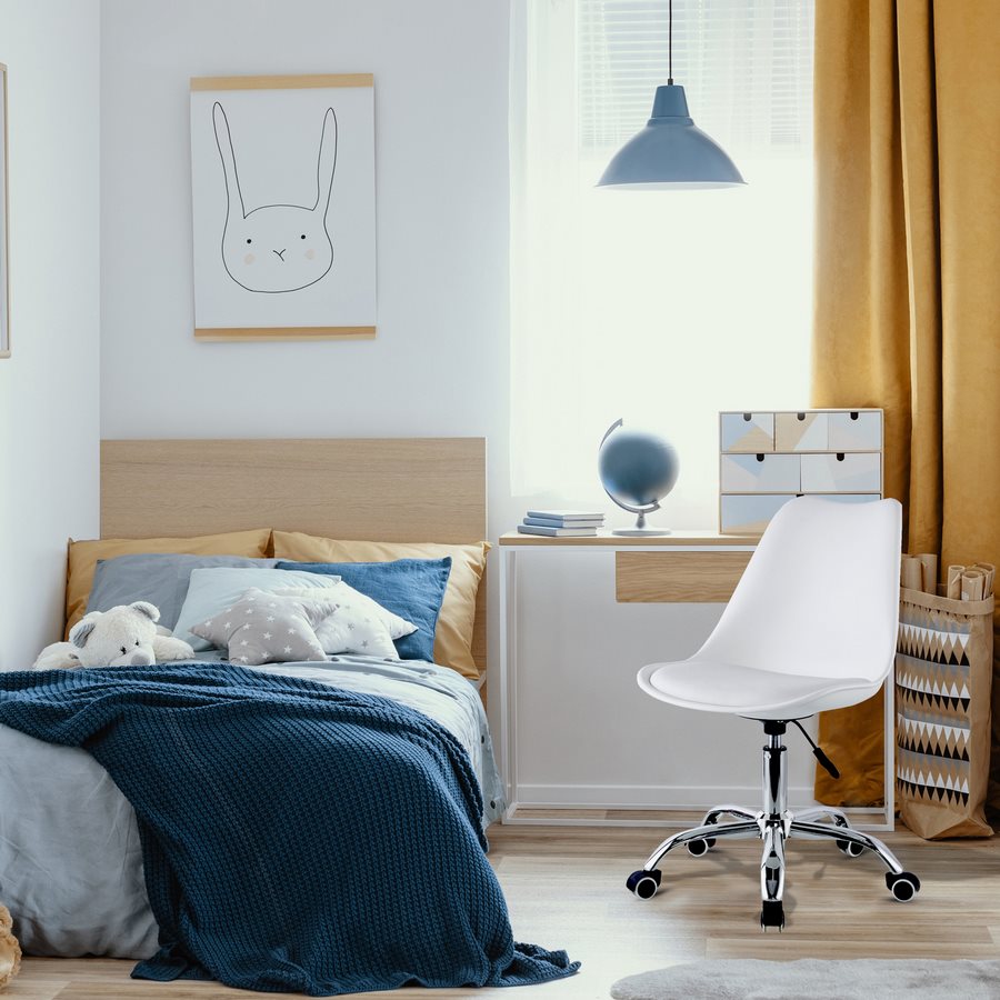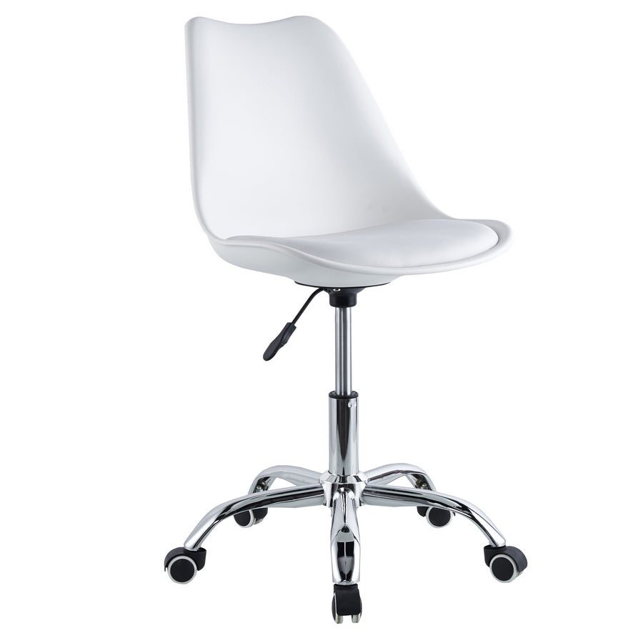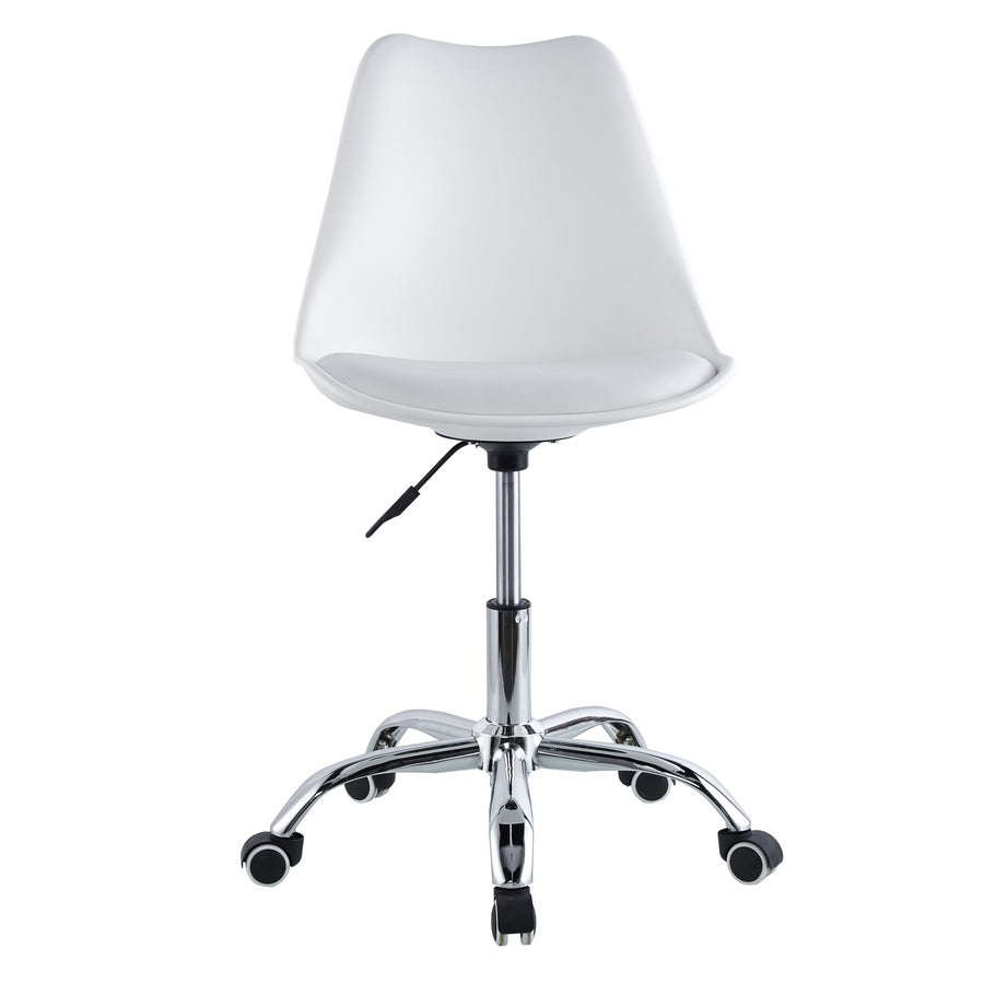 La nostra sedia ufficio con ruote May è funzionale, versatile e molto ergonomica. Nella sua colorazione bianca si presenta con uno stile senza tempo che unisce alla perfezione comfort e glamour. Una sedia ufficio dal design moderno che combina gambe in acciaio cromato, uno schienale e una seduta in polipropilene con cuscino in similpelle e un'altezza regolabile tramite pistone a gas. Questa sedia da scrivania, utilizzabile esclusivamente per uso interno, ci permette di muoverci liberamente grazie alle sue 5 ruote. Si adatta perfettamente con qualsiasi stile di mobili da ufficio, completando l'arredamento della vostra scrivania con eleganza e raffinatezza.