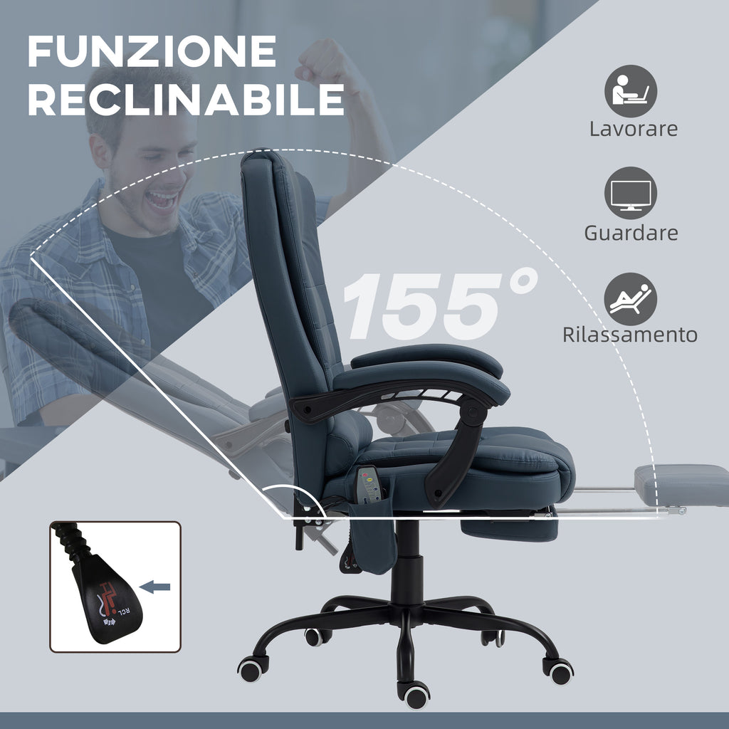 Poltrona da ufficio con 7 punti massaggianti totali su schienale e seduta. Telecomando incluso e tasca per riporlo. Schienale della poltrona massaggiante reclinabile fino a 155° per sdraiarsi comodamente. Altezza della seduta regolabile per adattarsi a ogni esigenza. Sedia girevole a 360° con 5 rotelle per una libertà di movimento ottimale. Seduta ergonomica, schienale, poggiapiedi e braccioli imbottiti con schiuma ad alta densità. Poggiapiedi retrattile e cuscino lombare integrato. Rivestimento sintetico facile da mantenere. Manuale di montaggio illustrato.