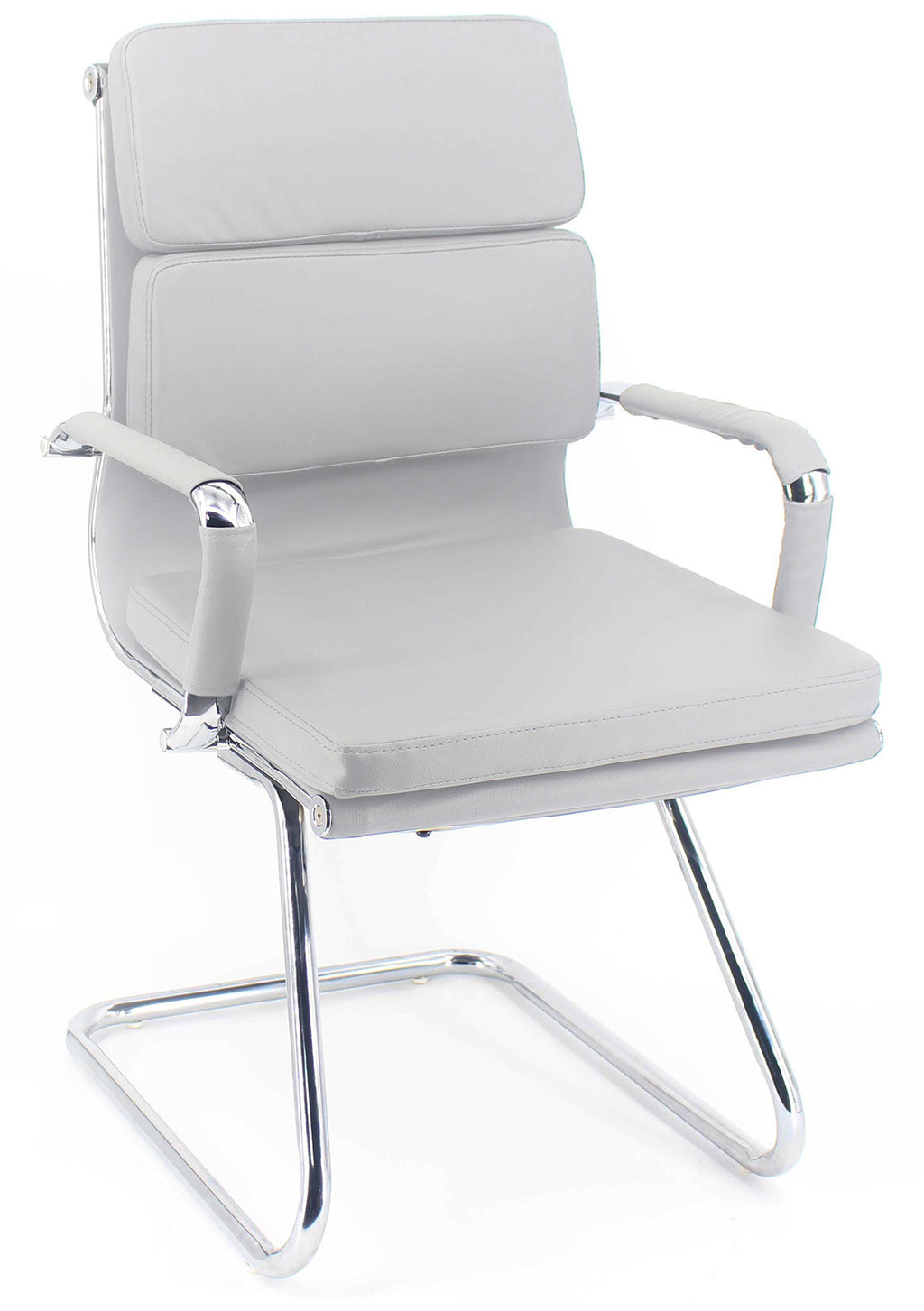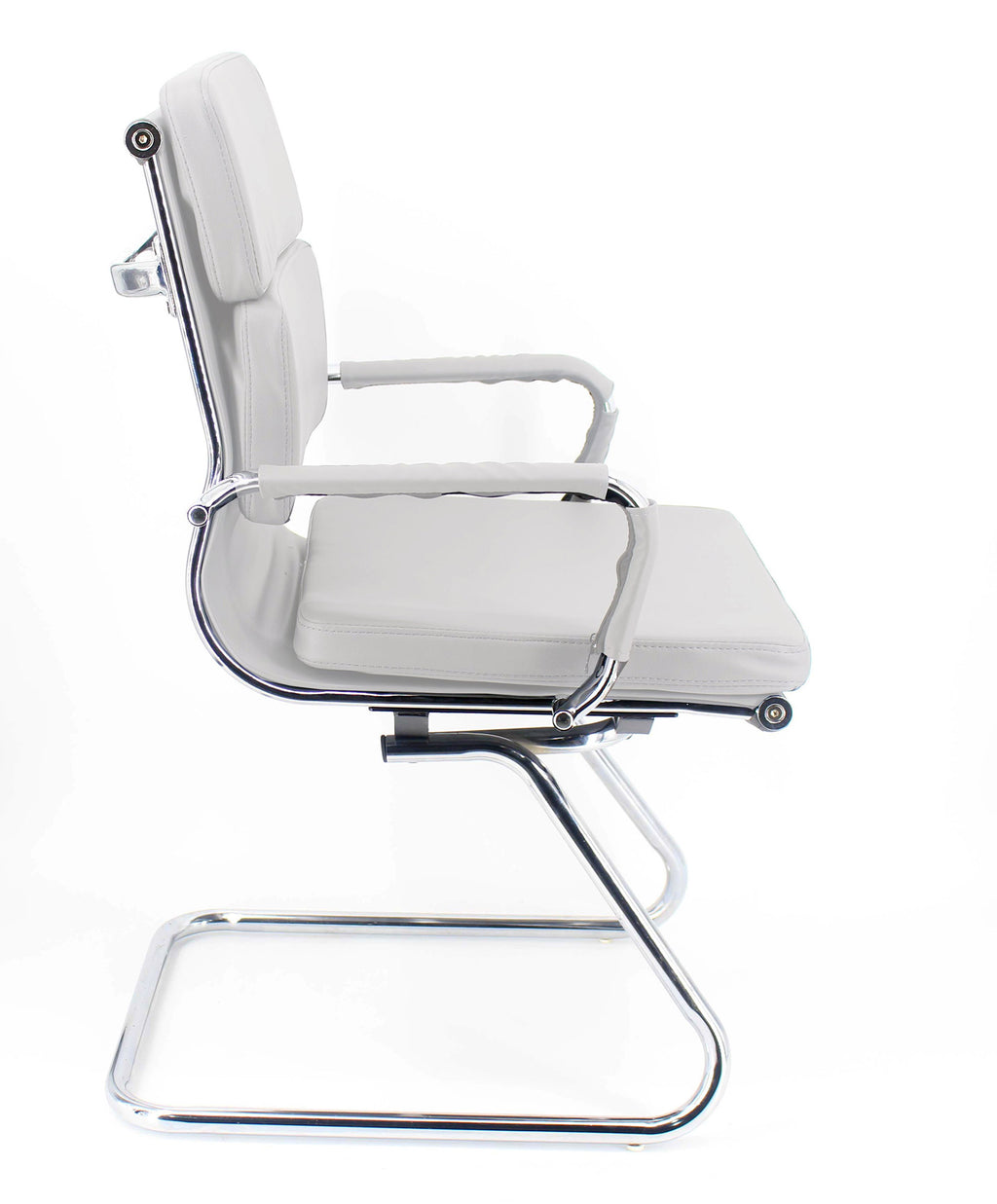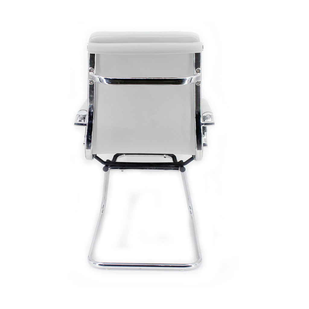 Chaise Fauteuil pour salles d'attente recouvert de similicuir blanc avec coutures apparentes et accoudoirs chromés incurvés.