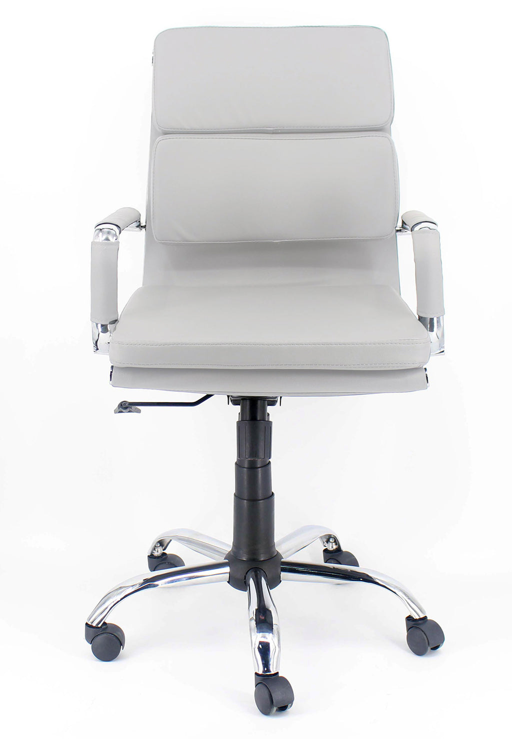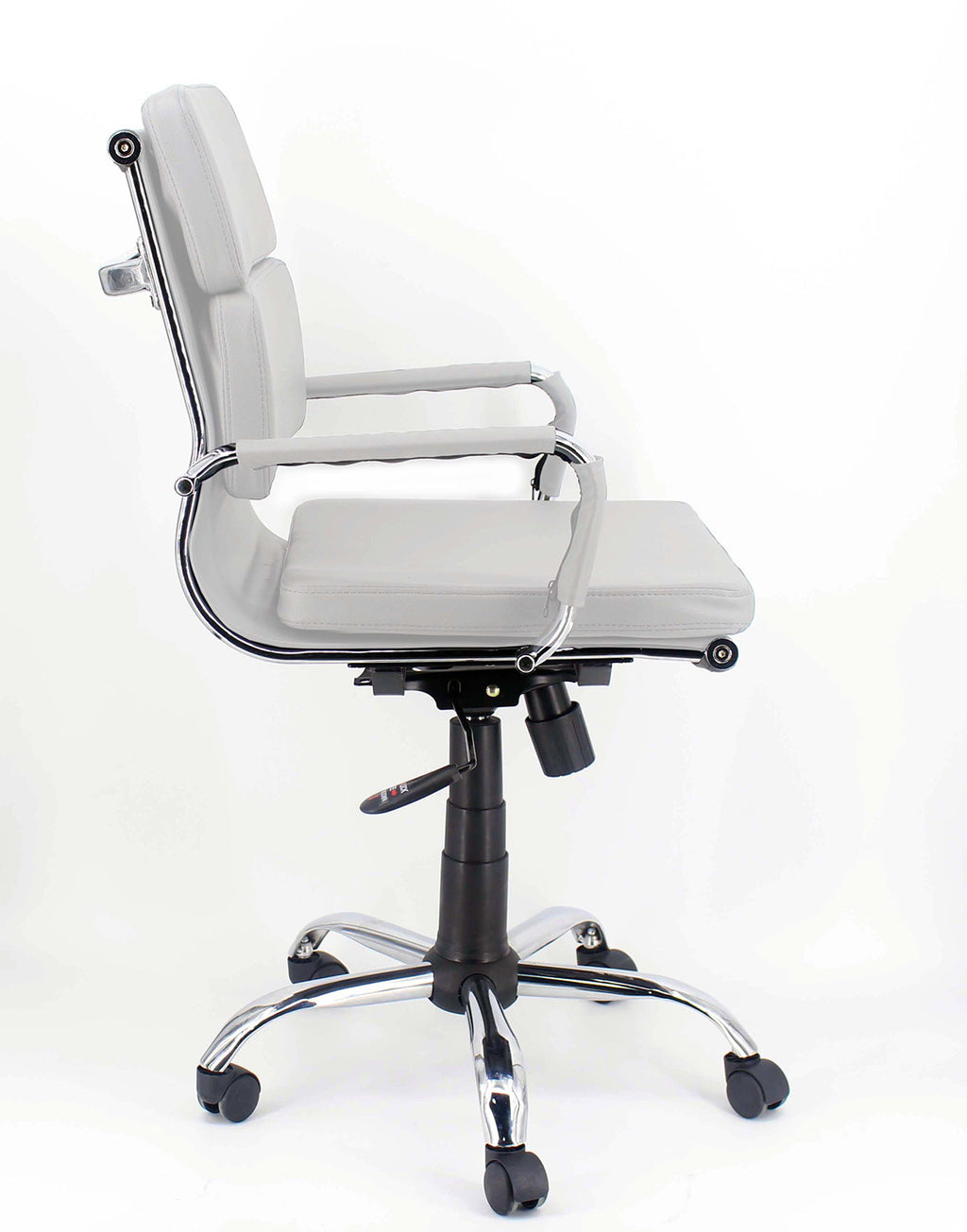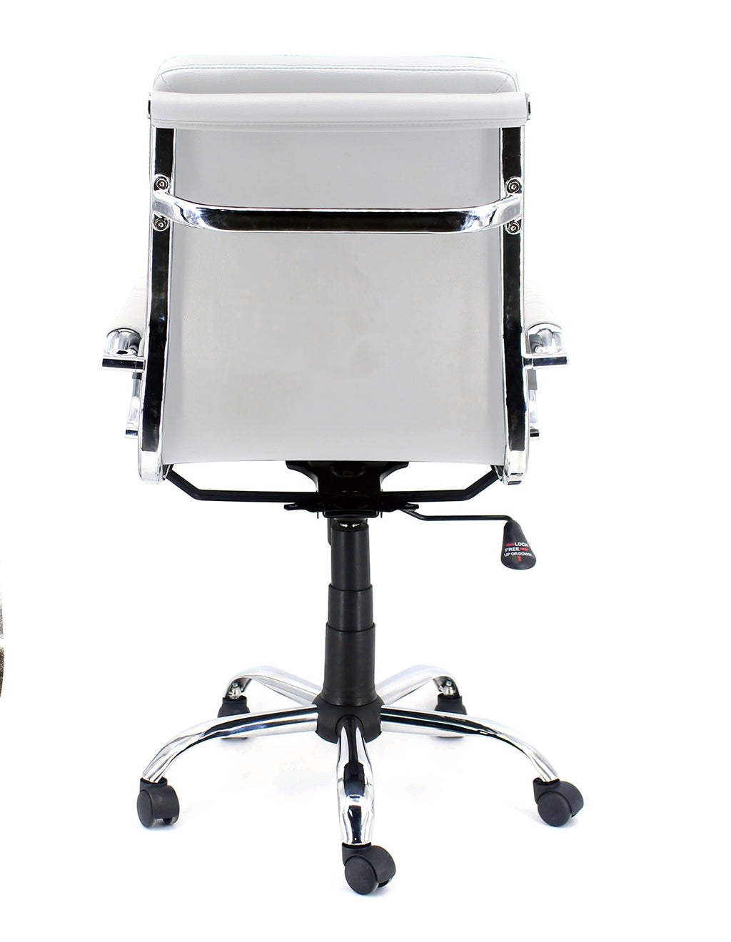 Fauteuil de bureau pivotant, équipé d'un mécanisme de levage à gaz et d'un mécanisme d'inclinaison. En déplaçant le levier vers le haut, on agit sur la hauteur du siège En déplaçant le levier vers l'extérieur, le siège passe en mode inclinable et revient en position fixe en ramenant le levier vers l'intérieur en position verrouillée. Structure en métal chromé avec base à cinq branches, équipée de roues en ABS. L'assise est rembourrée de polyuréthane recouvert de simili cuir noir. Le dossier est en trois modules rembourrés de polyuréthane et recouverts de simili cuir blanc. Housses d'accoudoirs en similicuir blanc.