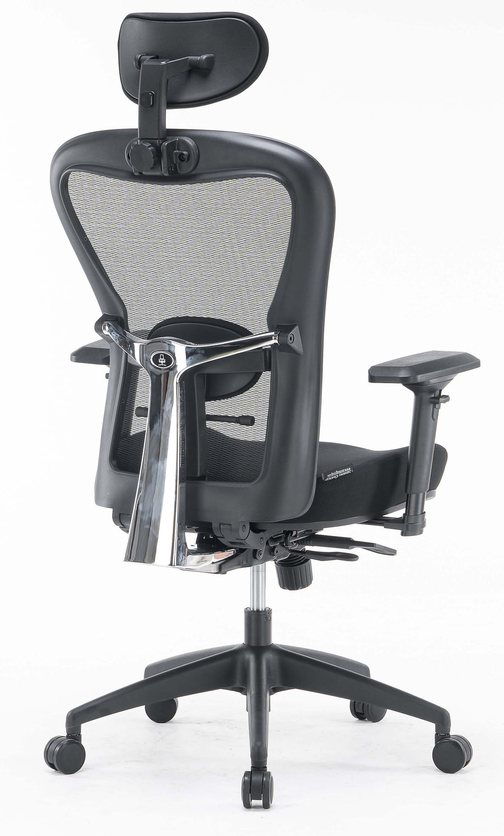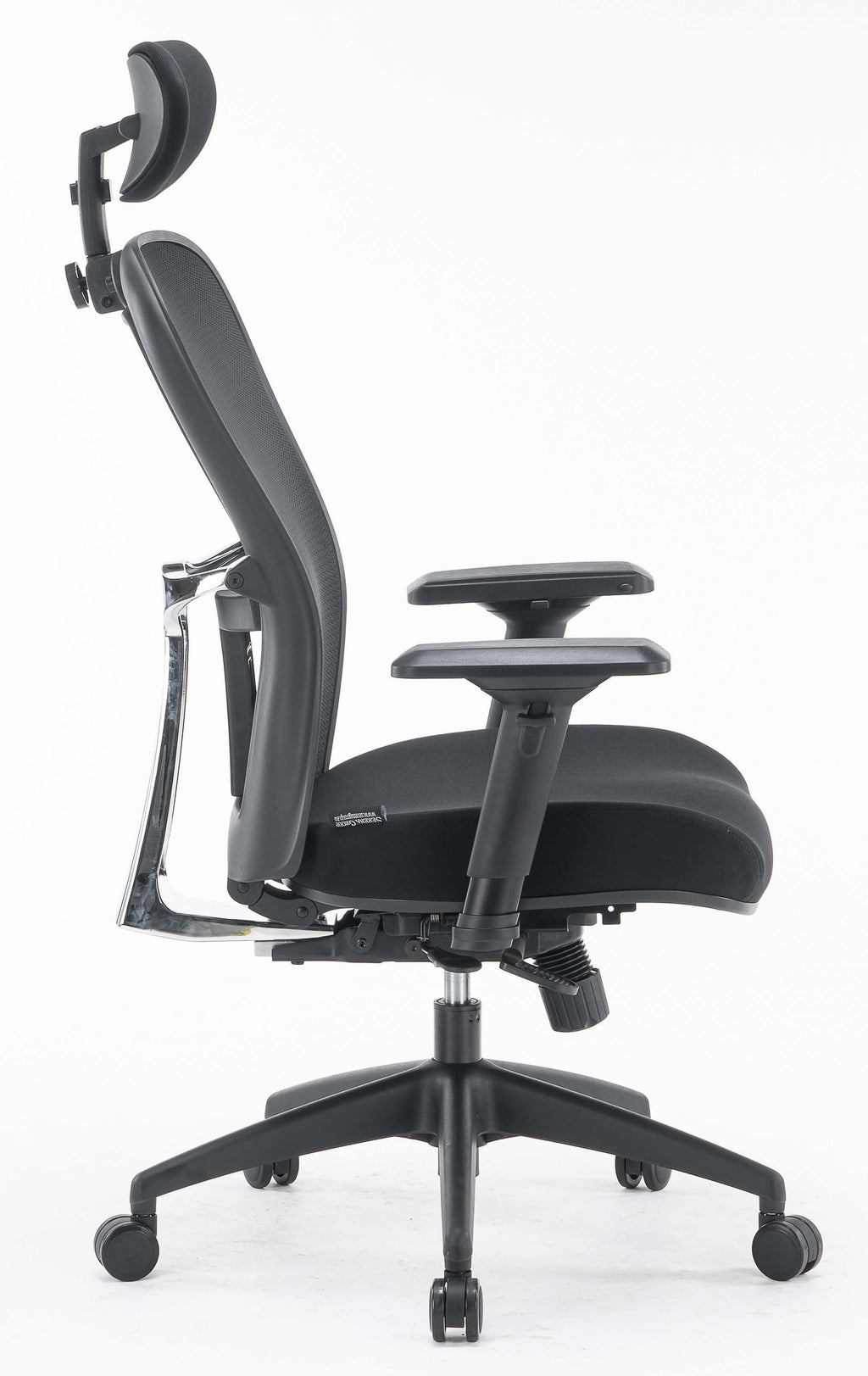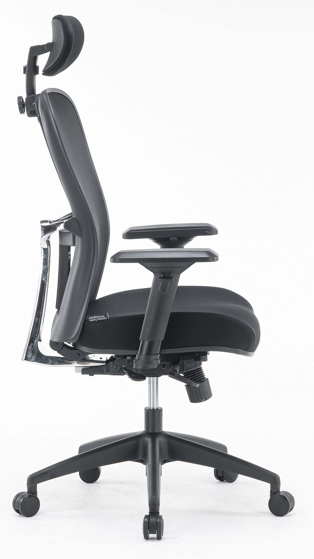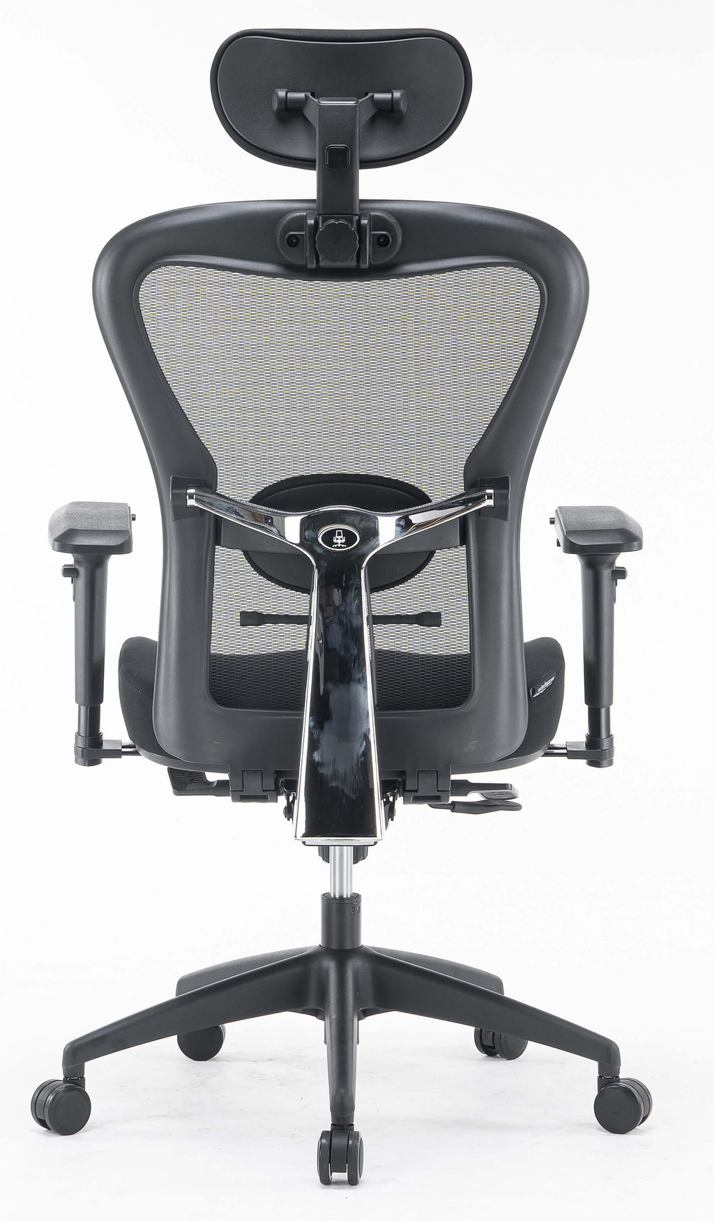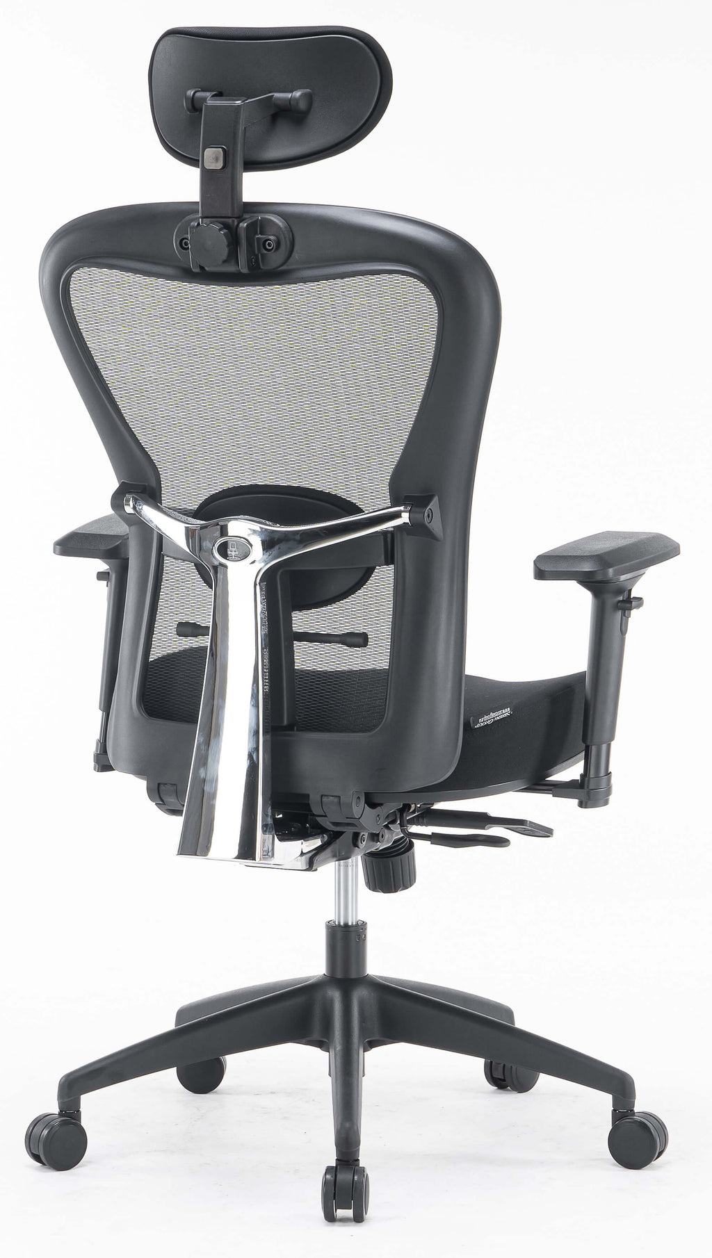 - Dossier réglable en plusieurs positions, recouvert de maille technique respirante noire avec appui-tête et support lombaire réglables en tissu rembourré noir