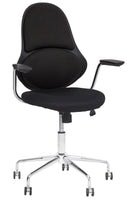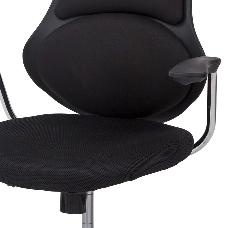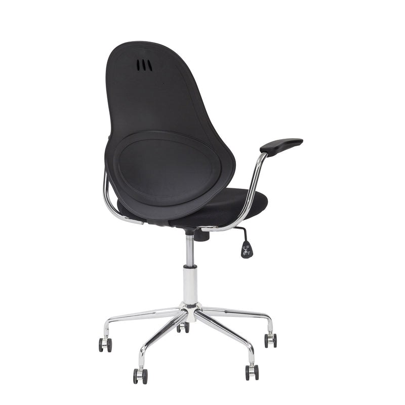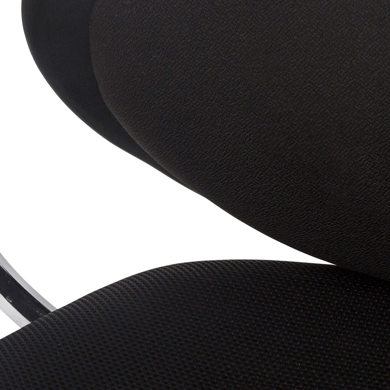 Fauteuil pivotant avec dossier inclinable et vérin à gaz, avec structure en métal chromé et assise rembourrée en texture noire.
