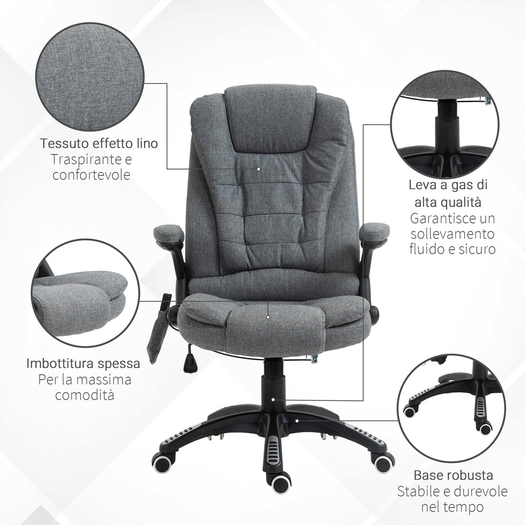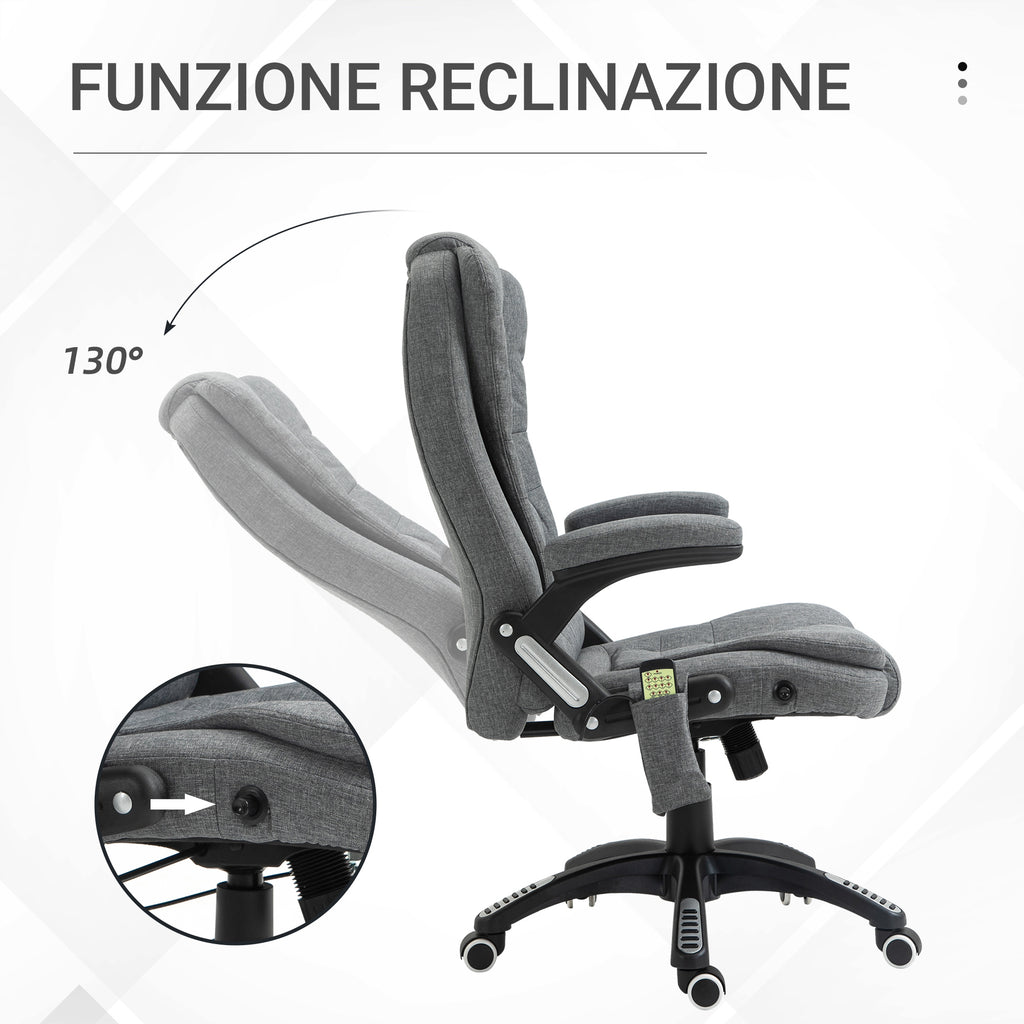 Après une longue journée, vous pouvez enfin vous asseoir et plonger dans une relaxation totale, laissant le fauteuil inclinable se charger de vous offrir un massage complet du corps, en particulier de la tête. La fonction de chauffage favorise la circulation sanguine et améliore l'effet de massage global. Il y a 7 points de massage au total : 1 sur la tête, 2 sur les épaules, 2 sur la zone lombaire, 2 sur les fesses. Vous pouvez vous allonger sur ce fauteuil de massage inclinable : le siège peut en effet s'incliner à 130° et la hauteur est réglable. Le design ergonomique fera le reste. Le fauteuil relax est fabriqué en tissu de lin durable et respirant, et avec un rembourrage en éponge pour un confort complet pour votre corps, bras inclus. Également équipé de roues pivotantes à 360°.