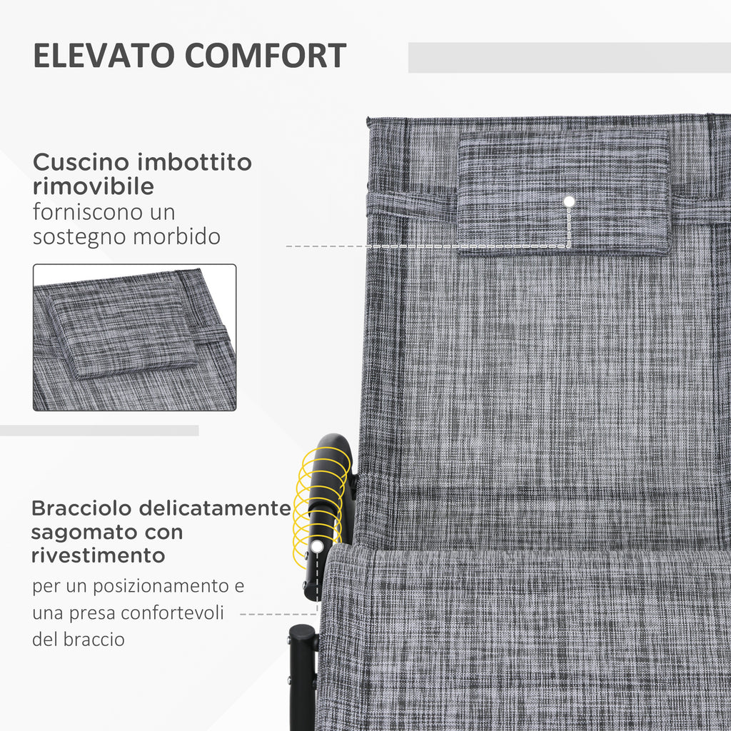 Goditi il relax all'aria aperta, in piscina o al mare, con la sedia sdraio a dondolo. Leggera e robusta, la sdraio da giardino è realizzata in metallo verniciato a polvere e texteline. Il suo design ergonomico ti assicura il massimo comfort: i braccioli sono curvi, per adattarsi al tuo corpo, e sono foderati in gomma per darti un morbido appoggio. Non perdere tempo, siediti e lasciati cullare da questa meravigliosa sedia a sdraio!