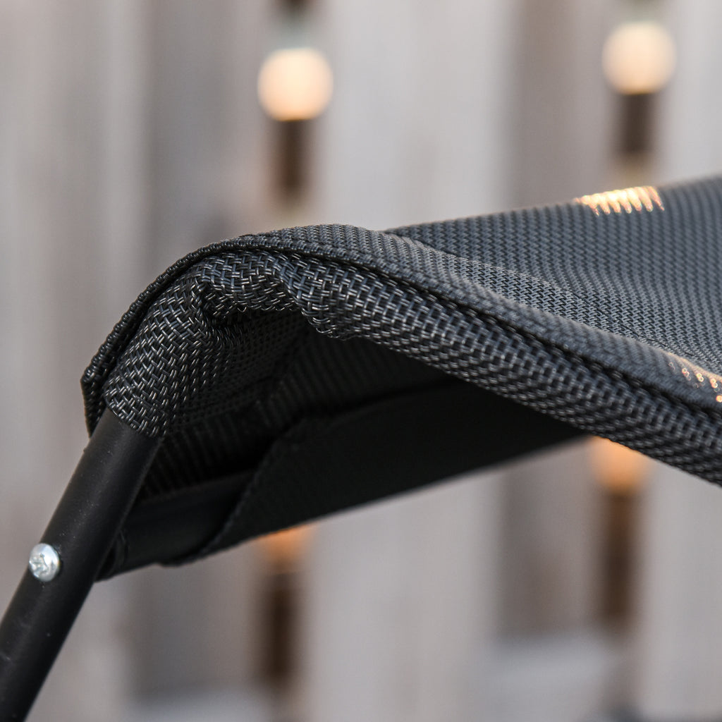 - ASSISE TEXTELINE : L'assise est en texteline et est reliée au cadre par un système de cordons élastiques. Comprend un appui-tête rembourré confortable et un auvent à angle réglable.