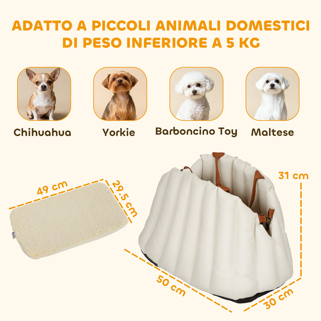 Seggiolino Auto per Cani Piccoli con Guinzaglio e Base Antiscivolo Convertibile in Borsa in Tessuto Oxford Crema