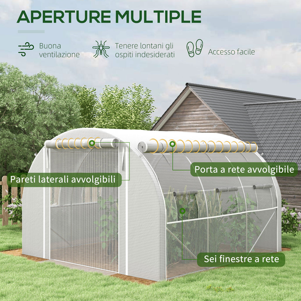 Serra a Tunnel con Porta e 8 Finestre Avvolgibili 3x3m Rivestimento in PE Bianca