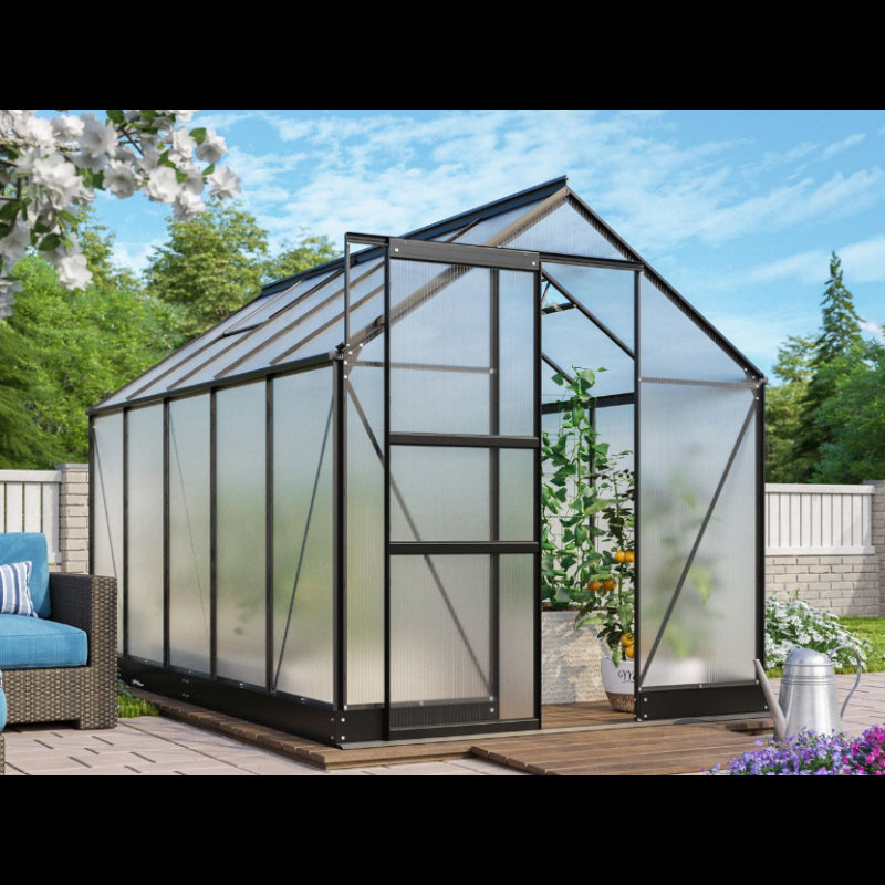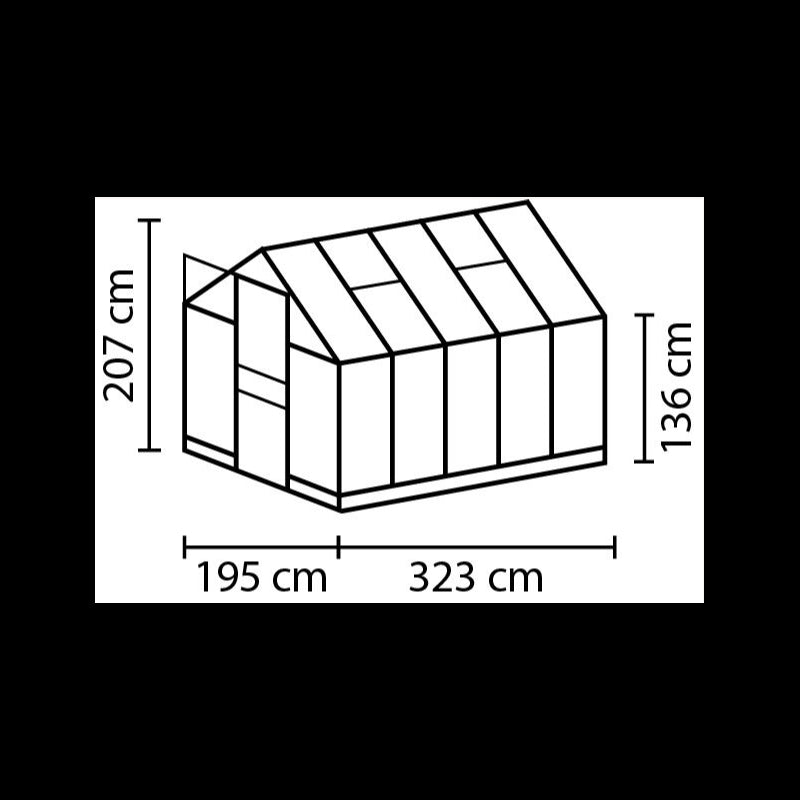 Dimensioni della base (larghezza x profondità): 194 x 325 cm - Altezza minima/massima: 136/207 cm - Superficie: 6.2 m² - Pareti in lastre di policarbonato alveolare doppia parete da 6 mm anti-UV