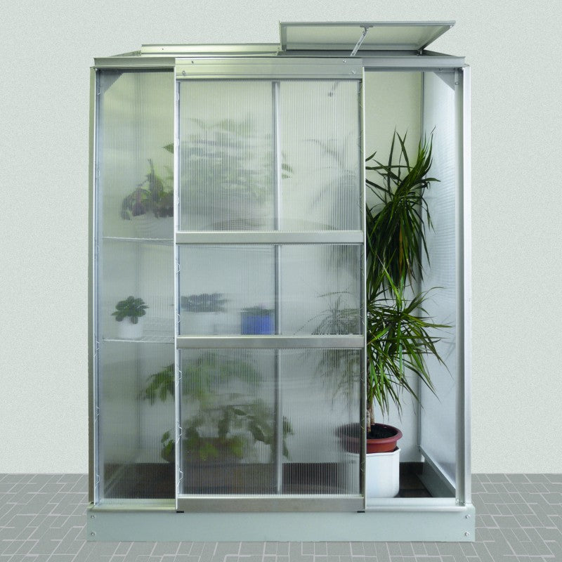 Con il suo ingombro ridotto e la piena altezza in posizione eretta, la serra addossata Ida può essere utilizzata anche in cortile, in terrazza o sul balcone, ideale per il giardinaggio, la coltivazione di erbe e ortaggi nonché lo svernamento di piante in vaso ad alto fusto. I modelli Ida sono disponibili in alluminio anodizzato, verniciato a polvere nero o verde smeraldo e sono ricoperti da lastre a due pareti di 4 mm di spessore in policarbonato stabilizzato ai raggi UV. I modelli più grandi 5200, 6500 e 7800 sono disponibili con lastre di spessore 4 mm o 6 mm. Il tetto di questi modelli è ricoperto da lastre di 6 mm. IDA 900 e 1300 hanno una porta scorrevole a scorrimento con una larghezza di 61 cm e un'altezza di 151 cm. I modelli dal 3300 al 7800 hanno una doppia anta scorrevole con una larghezza di 122 cm e un'altezza di 163 cm. La grondaia fa parte della dotazione standard. I modelli Ida da 900 a 5200 sono dotati di serie di un lucernario e Ida da 6500 a 7800 di due lucernari, utilizzati per una ventilazione ottimale. Come accessorio per tutti i modelli è disponibile un telaio di fondazione alto 6 cm in lamiera d'acciaio zincato e verniciato. Le serre da balcone o terrazzo della serie Ida non sono autoportanti! È necessario la parete di una casa o un muro stabile come parete di fondo. Per la coltivazione ideale di piante o erbe aromatiche consigliamo come accessori per i modelli 900 e 1300 due ripiani da 61 x 63 cm; per i modelli da 3300 i tavoli in alluminio.