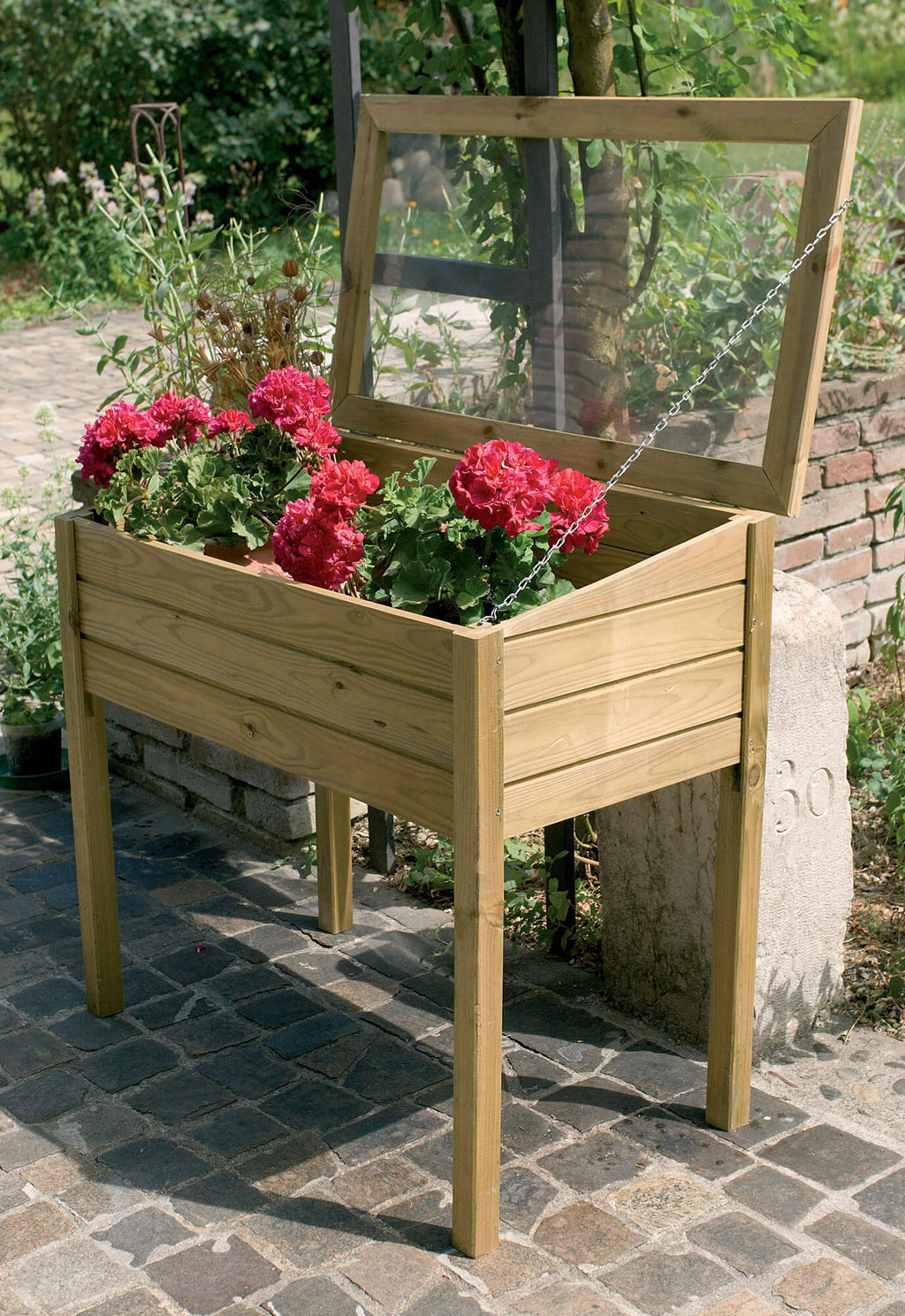 Serre pour graines en bois de conifère traité avec un procédé d'imprégnation profonde en autoclave. Ce traitement permet au bois d'avoir une couleur extérieure verte naturelle de longue durée, sans arsenic ni chrome.