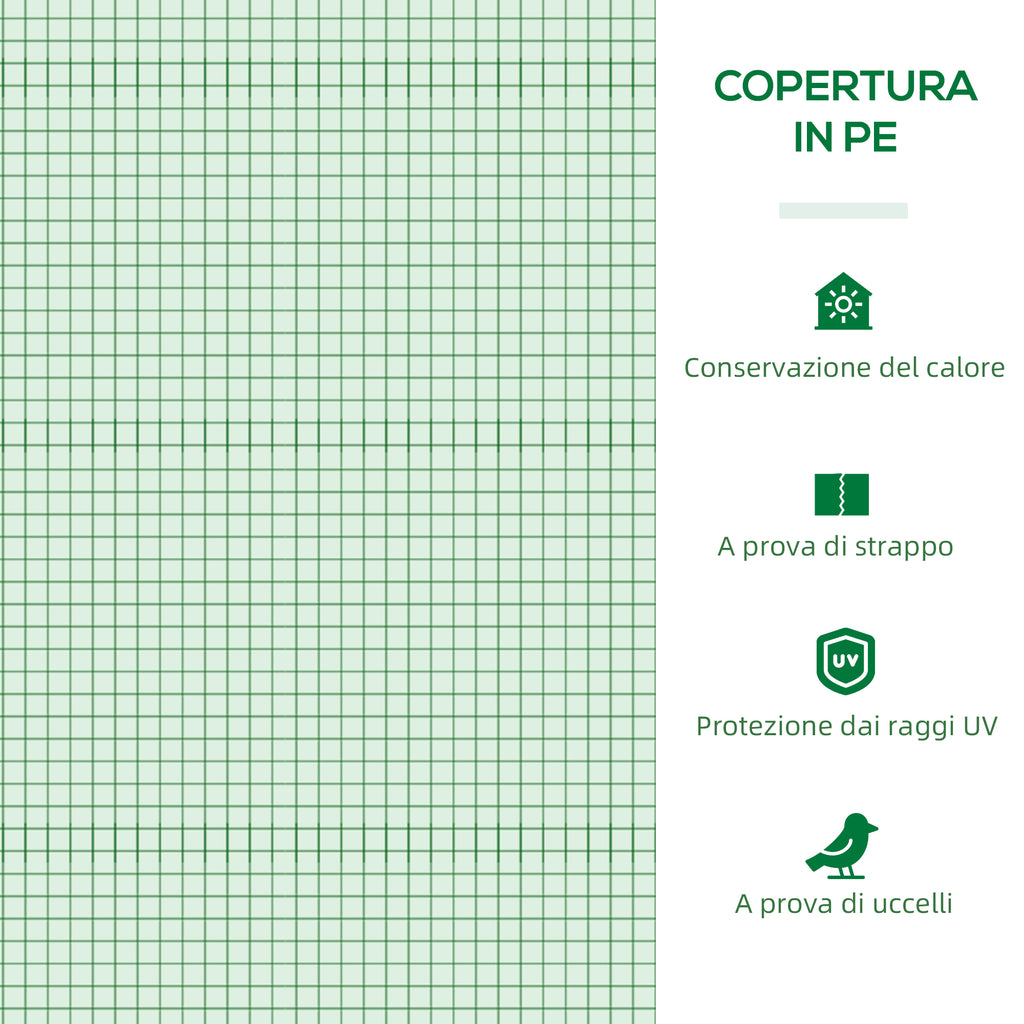 • COPERTURA IN PLASTICA: La serra a tunnel è munita di una copertura protettiva in PE contro le intemperie con griglia centrale per garantire una maggiore robustezza. I bordi allungati sono ideali per posizionare pesi o per essere interrati