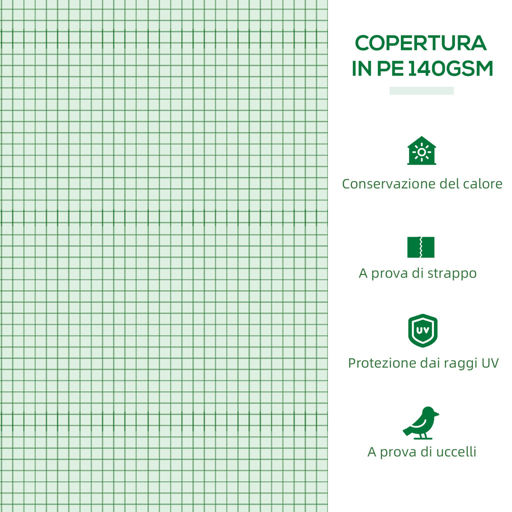 • COPERTURA IN PE: La serra a tunnel è munita di una copertura protettiva contro le intemperie con griglia centrale per garantire una maggiore robustezza. I bordi allungati sono ideali per posizionare pesi o per essere interrati