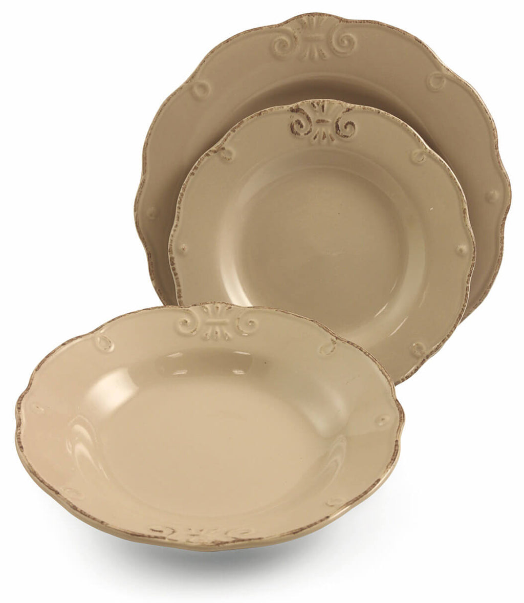 Le service Duchessa enchante par son bord ondulé, ses griffonnages en relief et sa finition antique qui nous catapultent soudain dans une atmosphère d'antan.