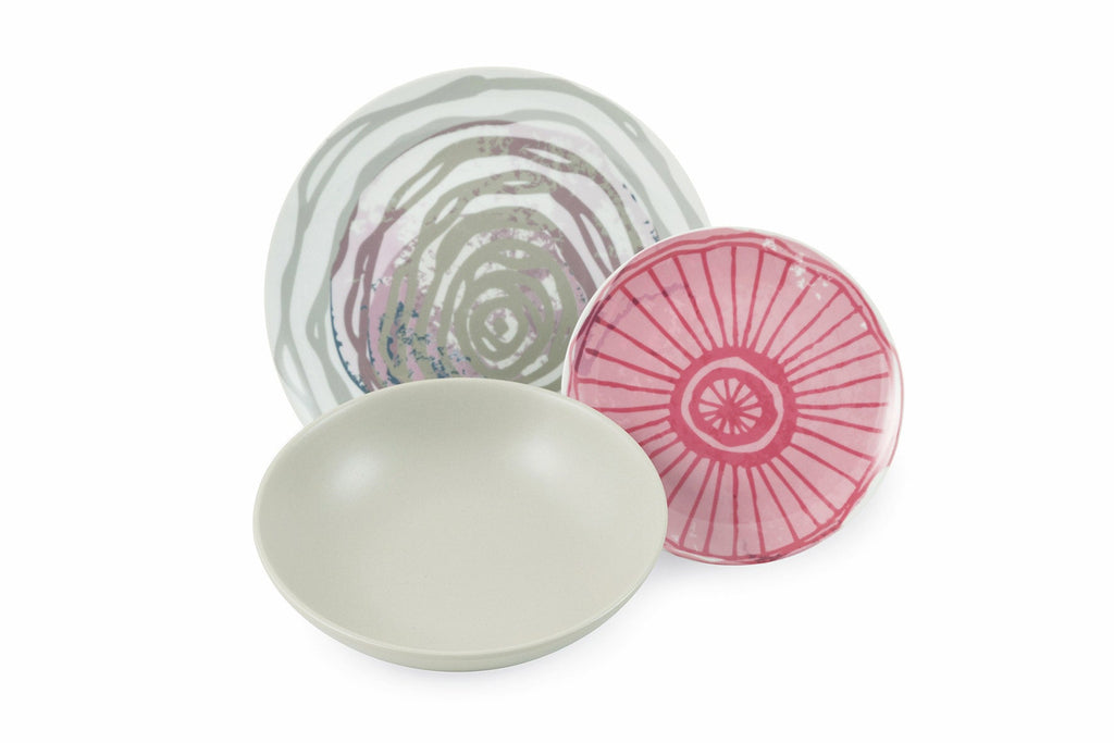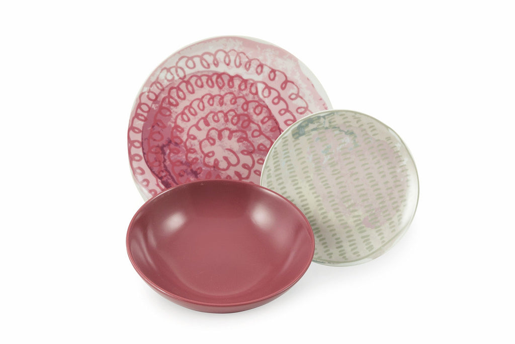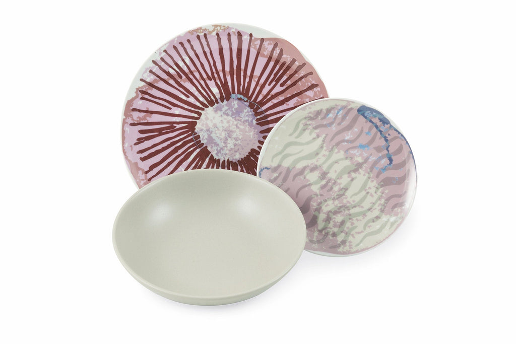 Porcelaine et grès : le mélange parfait entre fonctionnalité et raffinement. Élégance et légèreté distinguent les assiettes plates et les assiettes à fruits, réalisées en porcelaine blanche très fine sur laquelle est appliqué le décalque. Le grès émaillé des six assiettes creuses apporte cependant de la fonctionnalité à la table : épais et résistant, il maintient la chaleur des entrées chaudes comme les soupes et les bouillons et facilite leur service. La surface émaillée rehausse les couleurs de la table. Décomposé à table Chaque service est composé de 6 places de table, chacune avec un décor ou une couleur différente des autres plats du même service. Ceux qui choisissent les Scomposti auront une table non conventionnelle et différente, multicolore, avec une alternance de motifs et de couleurs. Nous attribuons à chaque convive assis autour d'une table une couleur différente, car chacun contribue de manière différente à la convivialité.
