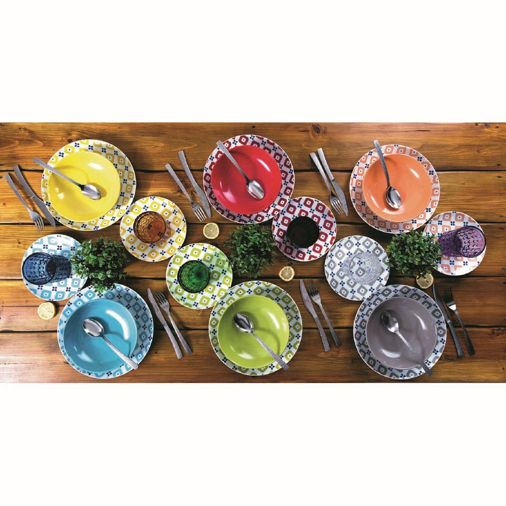 - Le grès émaillé des six assiettes creuses, quant à lui, apporte de la fonctionnalité à la table : épais et résistant, il maintient la chaleur des entrées chaudes comme les soupes et potages et facilite leur service. La surface vitrée rehausse les couleurs de la table.