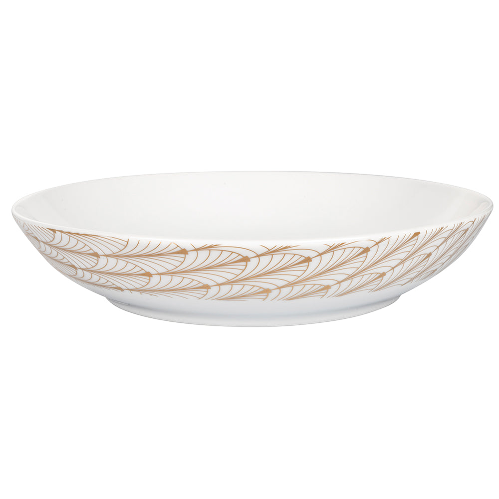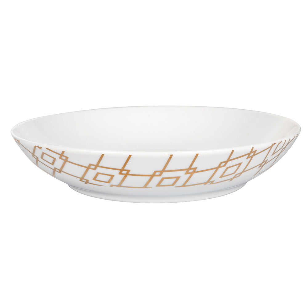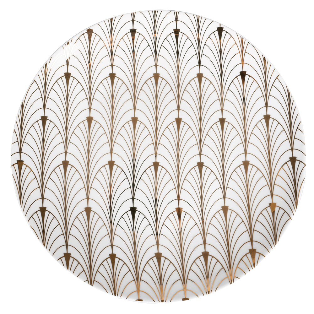Les années folles représentent l’une des époques les plus élégantes et les plus brillantes de tous les temps. Le style Charleston, comme la ligne du même nom proposée par Villa d Este, s habille d éclat, d éclat et de richesse de détails. Les détails dorés ressortent de manière claire et décisive sur le fond blanc brillant que la porcelaine met en valeur dans chaque détail des décompositions. Les lignes dorées créent un décor géométrique très précieux qui offre aux convives un cadre raffiné et classe. La mise en place suit le rythme de Charlestone !